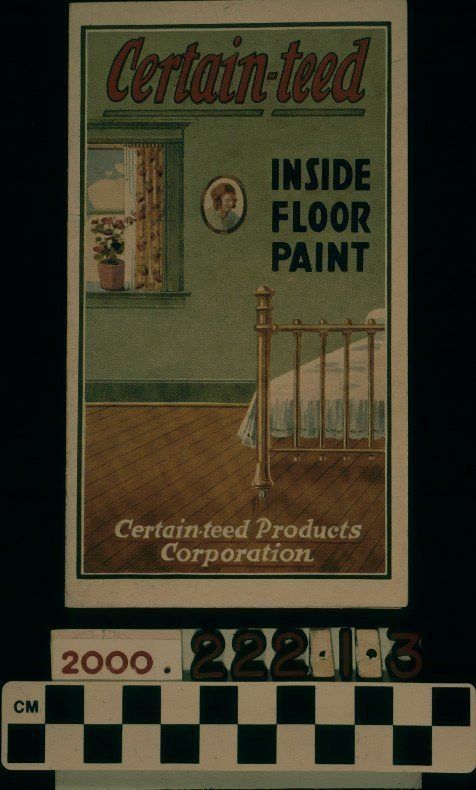 "Inside Floor Paint," issued by Certain-teed Products Corporation, ca. 1922. The pamphlet has a white paper cover with a drawing at the center of the inside of a bedroom. The room has a wood floor, a window at the left, and a bed at the right. At the top is the name of the company in red. At the right of the center in blue is the title. At the center of the bottom the name of the company is repeated in white letters. On the back is an advertisement for varnish stain. On the left page of the inside is information about the product which includes the best rooms to use the paint, its economical advantages, and its easy application. Included on the right page are eight color samples. The colors shown are silver gray, lead color, light olive, French yellow, drab, dark oak, red, and brown. The artifact is part of a group of four brochures that are items .1-.4. With light creases and some surface soiling on the back, the object is in good condition.Lexicon