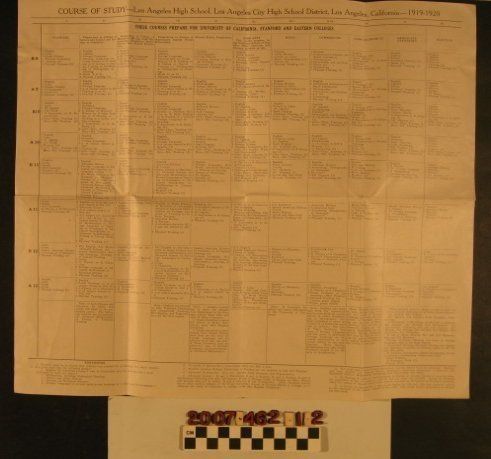 "Courses of Study--Los Angeles High School, Los Angeles City High School District, Los Angeles, California--1919-1920." The item is a chart of preparatory courses for admission to the University of California, Stanford, and "eastern colleges." It has semester indicators on the left, course study areas at the top and, within the corresponding boxes course listings. Notes are at the bottom. With folds, creasing, and light soiling, the condition is good overall.Lexicon