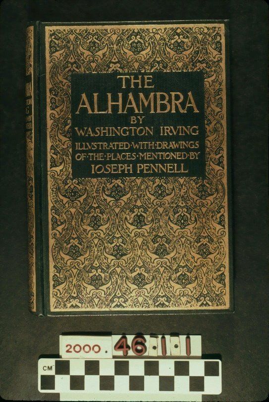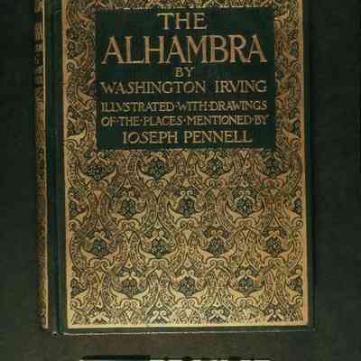 "The Alhambra," by Washington Irving (London: Macmillan & Company, 1896), 436 pp. A hardcover book, without a dustjacket, featuring blue edging on the front, within which is a background of interlocking floral designs of blue and gold. Over this at the top center is a blue box, within which, in gold lettering, is the title, author's name and a note of illustrations by Joseph Pennell. A similar pattern is on the spine with a small box at the top containing the title, author's name, and illustrator's name, while the publisher's name is at the bottom. An introduction by Elizabeth Robins Pennell, presumably the wife of the illustrator, is at the front, followed by the table of contents, before the text begins. The work is a diary-like recording of Irving's 1829 stay in legendary part of Granada, including his recollection of figures like the Spanish royalty and other visitors. Illustrations by Joseph Pennell include drawings and paintings. The book is in fair condition, though there are some abrasions on the back cover, a dented cover corner, loosening of the binding at pages 225-26 and some often heavy foxing on pages.Lexicon
