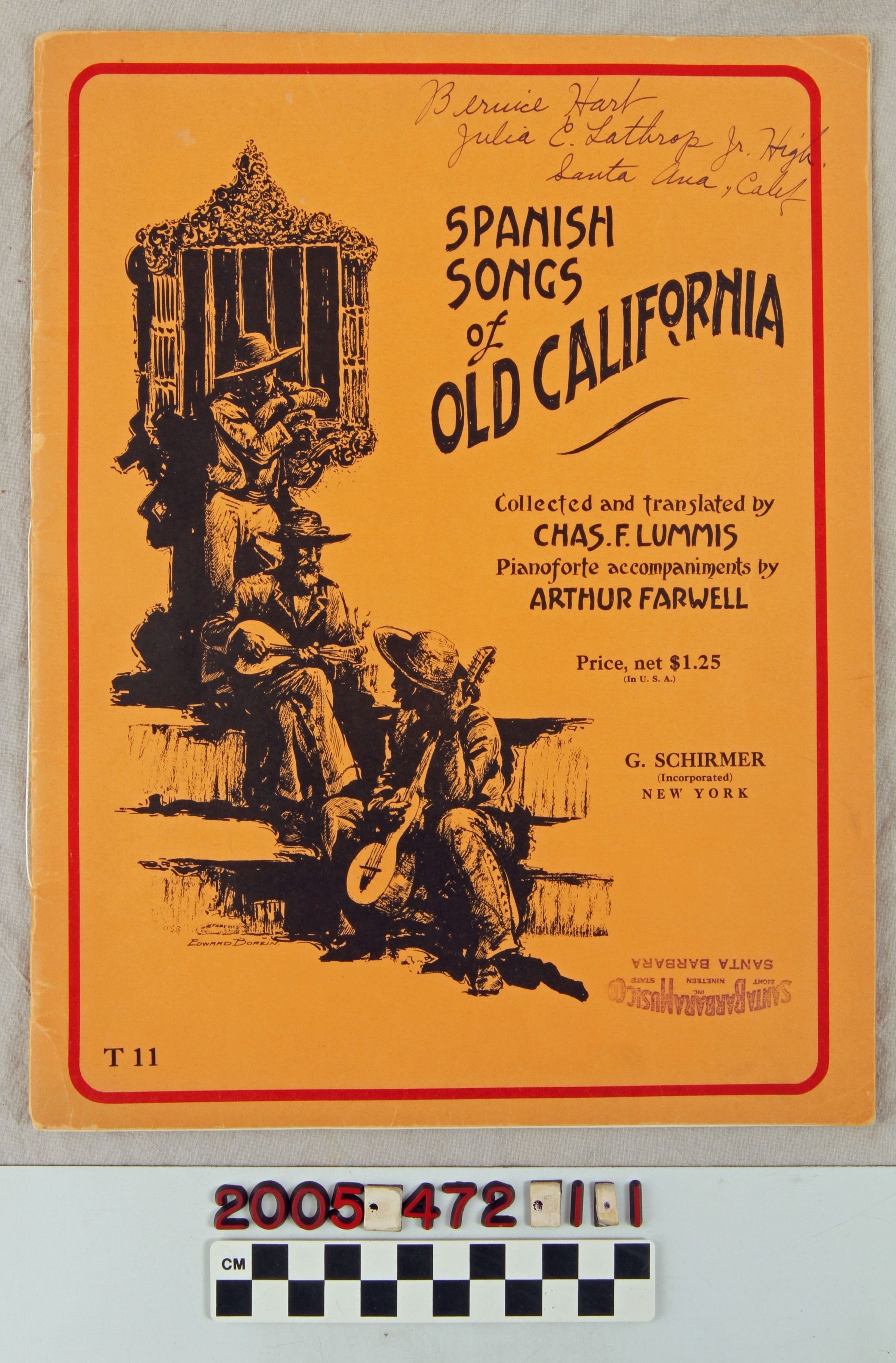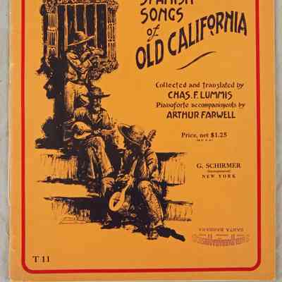 SONGBOOKS, "SPANISH SONGS OF OLD CALIFORNIA," collected and translated by Charles F. Lummis with accompaniments for piano by Arthur Farwell, published by G. Schirmer, New York, 1929 with 1923 copyrights to Lummis. There are fourteen songs and an essay by Lummis and note by Farwell on the music and its value. A stamp from a Santa Barbara, California music store and an ink inscription by the owner are on the front cover. With some pencil markings, cover creases and dogeared and dented corners and light cover soiling, the condition is good.Lexicon