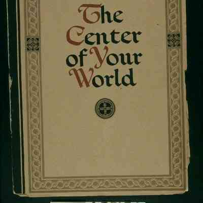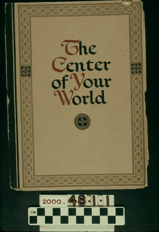 "The Center of Your World," a house-plan catalog printed by Rogers & Company and issued by the Curtis Service Bureau, ca. 1920s. The front cover has a thick and a thin black vertical line toward the spine and a gold border with a serpentine design in it and two black boxes with four-petaled flowers above center within the border. The title, with the first letter of each word in red and the rest of the letters in black ink, is at the center with a round four-petaled floral design below the title. On the back is the name "CURTIS" and the year "1866" above it, both within the same border as the front. The work provides examples of architect-designed house plans offered by the bureau and includes an essay about houses, with extensive quoting from an architect from the firm of Trowbridge & Ackerman, which designed the home plans in the pamphlet. The offerings are divided into four types (as opposed to styles), these being the Colonial, English, Southern and Western. Further essays explain the characteristics of each and there is an abundance of drawings of exterior views, as well as interior elements, such as stairs; doors; built-in furnishings; wainscoting and exterior elements, such as doors, windows and dormers. At the back is a statement of quality and a listing of manufacturing and distributing plants and sales offices for the bureau. The cover edges have much wear and tear and there is a crease from a vertical fold in the entire document, which is in fair condition.Lexicon