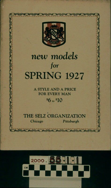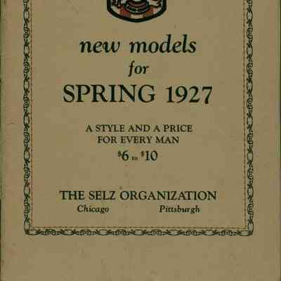 "New Models for Spring 1927," a shoe catalog issued by The Selz Organization, 1927. The softcover artifact has a border with a vine-like outside and an orange interior. At the top within the box is the company logo, with the title underneath, the words "A STYLE AND A PRICE / FOR EVERY MAN / $6 to $10" and the company name and locations at the bottom. The flysheet is an introduction to the catalog, followed by product offerings, which give a model number, description, and range of sizes and widths and are accompanied by a black and white and color images. Most shoes come in a choice of black or tan, though some are only available in one. Dress shoes predominate, though there also ones for golf and arch support. A few of the offerings have high tops at the ankles. One page provides a list of advertising "helps" including newspaper cuts, style books, cut-out cards, company letterhead, shoe lace cards and matchbooks. At the back is a list of merchants who sell Selz shoes along with a guarantee of mail order shipments. A price list insert is item 1.2. Though the pages are fine, the cover has fairly extensive foxing; surface soiling and some stains, a tear at the bottom front cover; creases; and evidence of pest infestation and the artifact is in fair condition overall.Lexicon