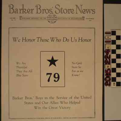 "Barker Bros. Store News," monthly company newsletter for the furniture store, Barker Bros., published for its employees, volume 1, no. 10, November 1918. An eight page publication featuring a message from W. A. Barker, the company president, news of the war with Germany, acknowledging employees in the war, personnel changes, tips for job performance, electric exhibits in the Orange County Fair, new household technologies like vacuums. The newsletter is in good condition with minor creasing and tears from general use.