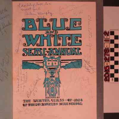 "Blue and White Semi Annual," Los Angeles High School yearbook, Winter 1928. The yearbook includes photographs of students, faculty and staff. Includes names and lists of clubs, academic activities, sports teams. It is a hard bound volune with a blue cover, embossed with the school name, title and an illustration of a school building. The book also includes classmate signatures. It is generally in good condition.