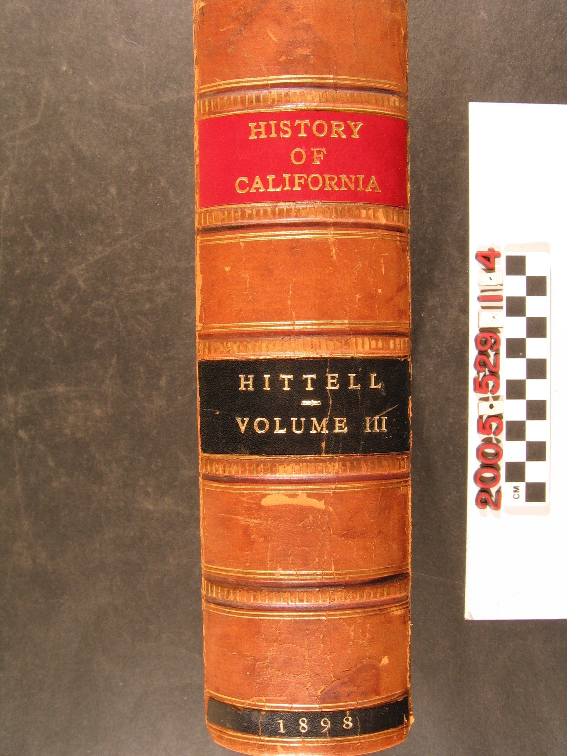 BOOKS, "HISTORY OF CALIFORNIA," VOLUME 3, Theodore H. Hittell (2nd ed., San Francisco: N.J. Stone and Company,) 1898. A general history, one of four volumes, covering such topics as gold mining, 1850s San Francisco, the growth of the state during the 1850s, filibustering, and the treatment of Indians, including wars with them. While the cover has some weakness to the spine hinges, scratches, and soiling, the pages are tight and clean and the overall condition good.