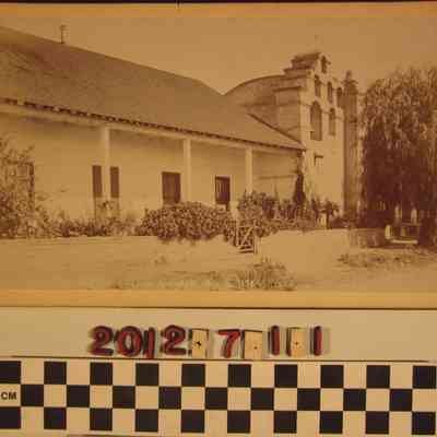 "898. San Gabriel Mission, Founded Sep 8, 1771," W. H. F., 1890s. The image is taken from the southwest and looks toward most of the adobe rectory with its broad hipped roof and tall porch and a small courtyard fronted by a brick wall and gate. To the right is the belfry of the old stone church and other portions are obscured by a pepper tree next to the sidewalk running along the length of the structure. The caption is in white ink at the bottom and "W.H.F." might by William H. Fletcher, a Los Angeles photographer from 1885. With curving of the mount, a dent at the top center of the mount and some soiling, the overall condition is good.Lexicon