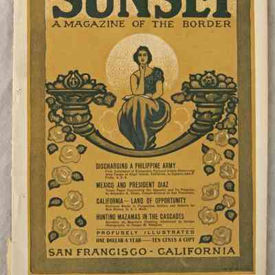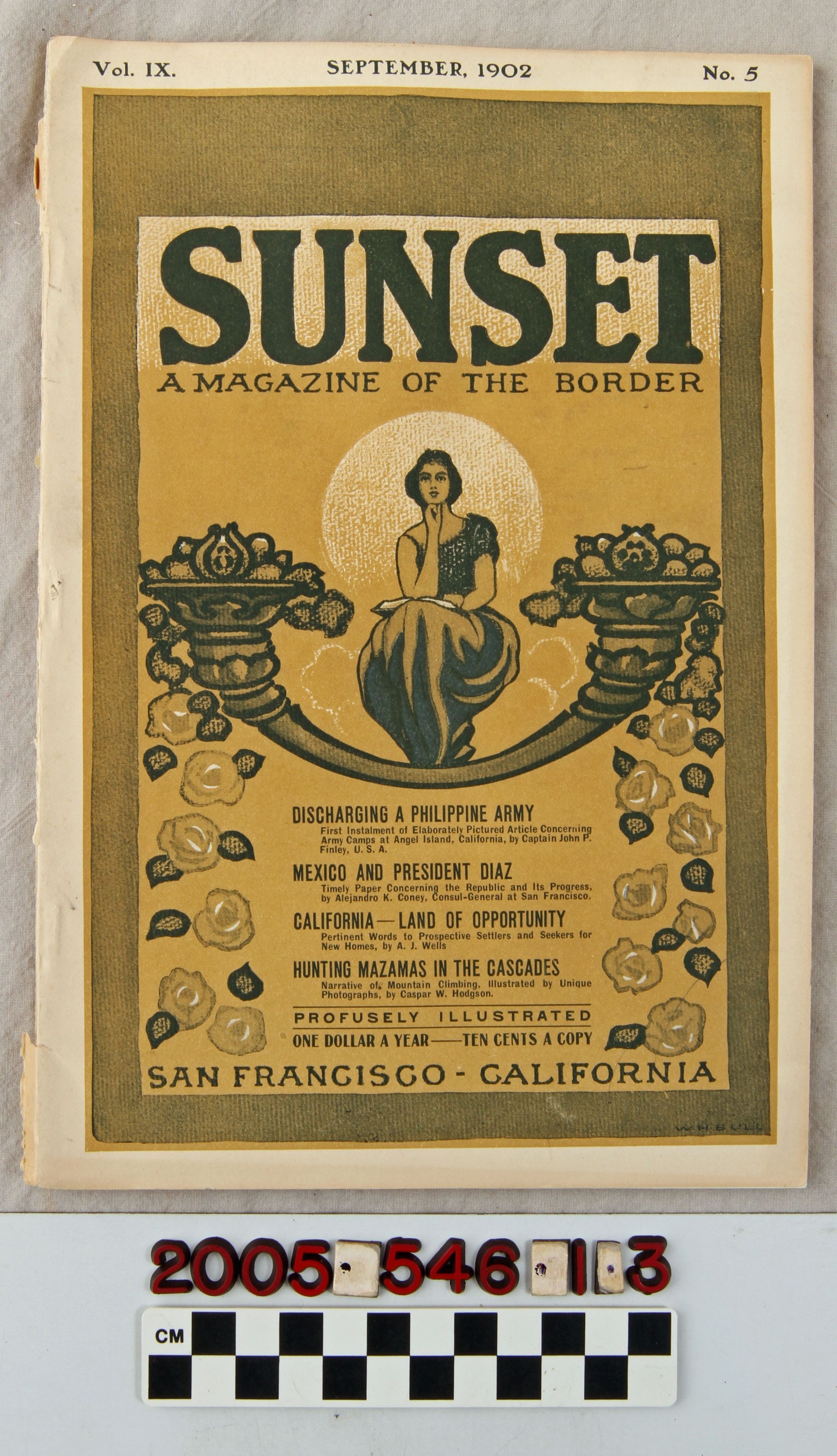 MAGAZINES, "SUNSET," September 1902. There is tearing at the spine and some discoloration and staining on the front cover and the back cover is missing, but the pages are generally clean and tight, so the condition is fair.Lexicon
