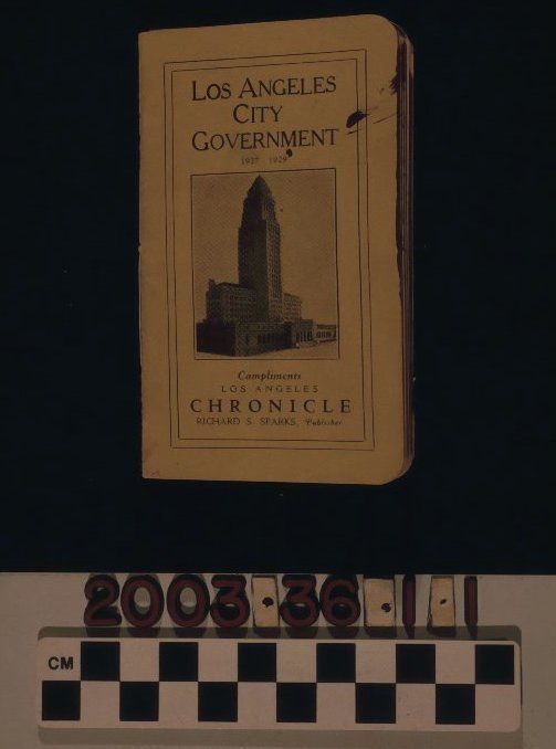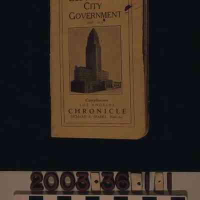 "Los Angeles City Government: 1927-1929," published by the Los Angeles Chronicle, 1927. The booklet has 38 pages with a yellow paperback cover. The front cover, which is printed in black, has the title at the top, and at the bottom "Compliments / LOS ANGELES / CHRONICLE / RICHARD S. SPARKS, PUBLISHER." At the center is a black and white photograph of Los Angeles City Hall. On the reverse of the front cover is the City Hall address and telephone number. The following pages contain a title page and an index. Listed in the artifact are the names of the city's major officials, boards, and departments, like that of the mayor and law enforcement. Included in the listings are applicable addresses and room numbers for those departments and officials located within City Hall. With cover creases and soiling; browning and folds on many of the pages; a corner to page 20 missing; stains; tarnish on the staples; tears; and overall wear, the artifact is in fair condition.Lexicon
