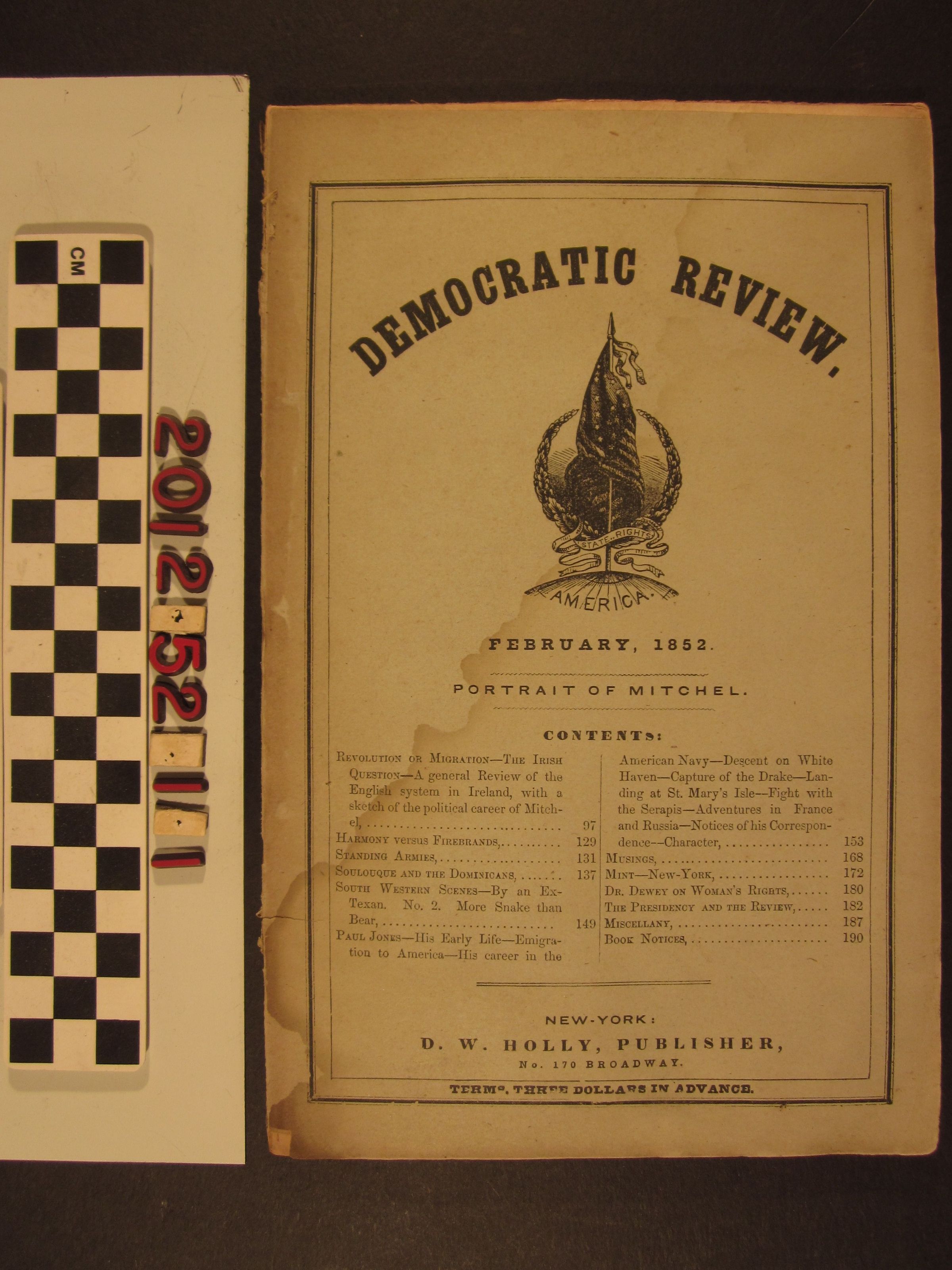 "Democratic Review," February 1852 (No. CXLIV), published by D.W. Holly, New York. The issue contains an article about the need for constructing an additional national mint at New York to handle that increased traffic in gold, principally from Gold Rush California. The piece has statistics on gold production, as well. The overall condition is fair with water stains, soiling, creases, edge rubbing and browning.Lexicon