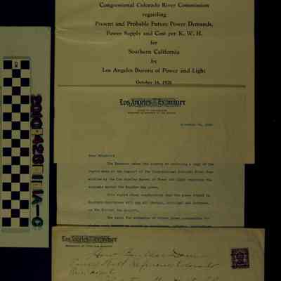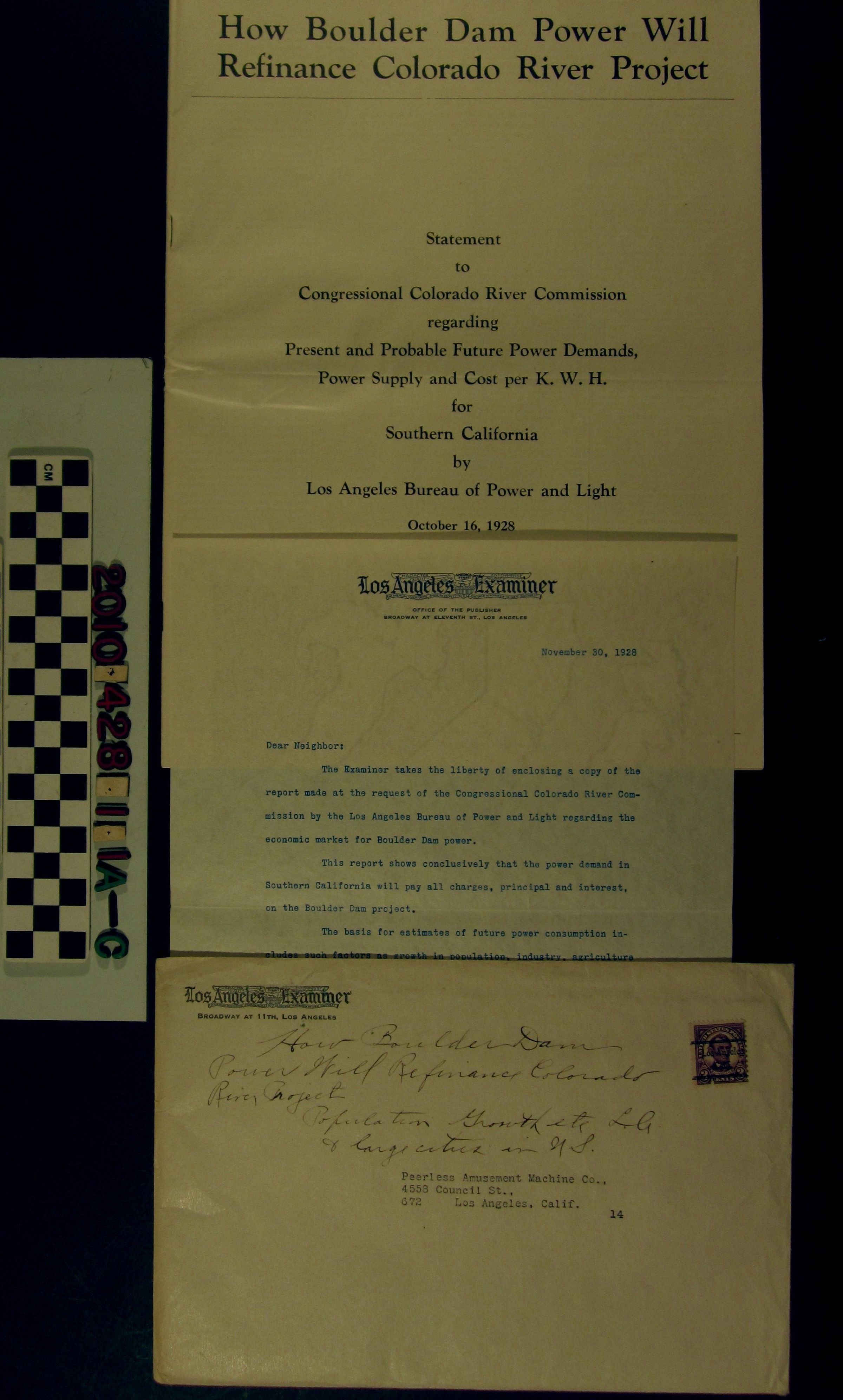 "How Boulder Dam Power Will Refinance Colorado River Project," from the Los Angeles Bureau of Power and Light and reprinted by the "Los Angeles Examiner" newspaper, with cover letter and mailing envelope, 16 October 1928. The 24-page pamphlet (a) consists of the Bureau's statement to the Congressional Colorado River Commission and lays out the argument that supplying power to Los Angeles and southern California generally from the river would pay for itself. There are many tables showing population growth and electricity use in the state and region from, in most cases, 1914 to 1928 and, in some, back to 1890. Other tables show electricity use from the state's power companies, while, at the rear, are a series of charts covering much of the same information. The letter (b) is from G. G. Young, the "Examiner"'s publisher, summarizing the report. The envelope (c) is addressed to a Los Angeles business and has a handwritten note as to the title of the report. The condition of the pamphlet and letter is good and the envelope is fair.