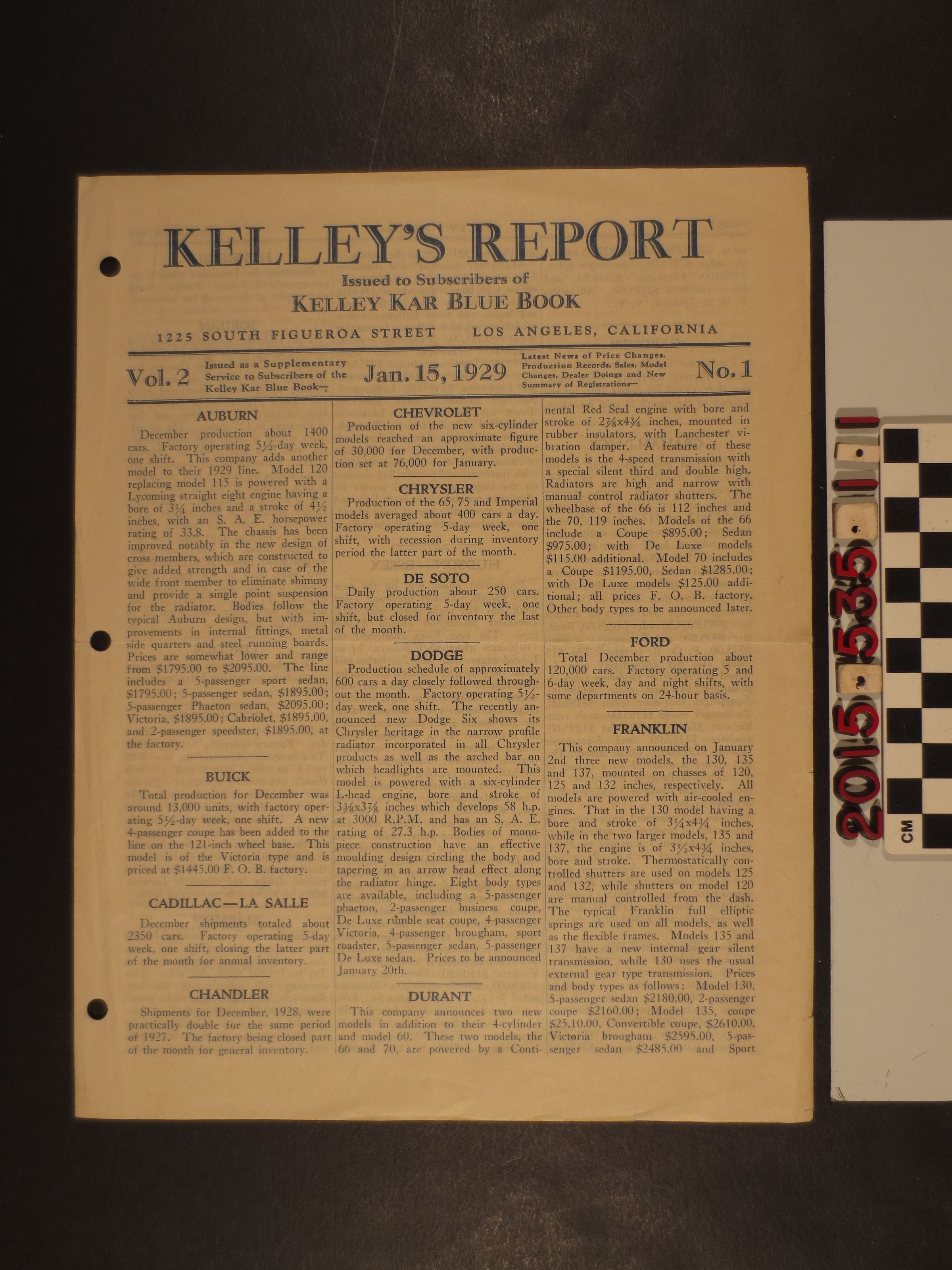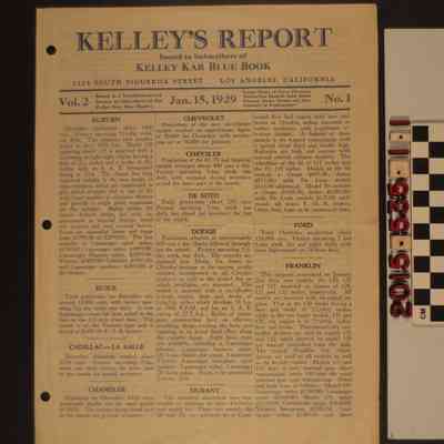 "Kelley's Report," Vol. 2, No. 1, 15 January 1929. The newsletter was issued to subscribers of "Kelley Kar Blue Book." Published at 1225 South Figueroa Street, Los Angeles. The publication provided news on price changes, production records, sales, model changes, dealer news, registration news for automobiles. The newsletter lists by model name. The item is in good condition with minor creasing and tears.Lexicon