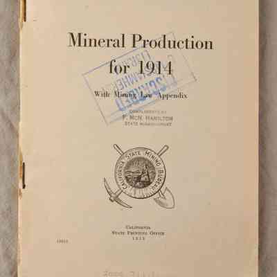 "MINERAL PRODUCTION FOR 1914," California State Mining Bureau, Bulletin No. 70, July 1915 (Sacramento: California State Printing Office,) 1915. The document provides a summary of the mineral industry with tables showing production and values for 1913 and 1914, as well as specific sections on fuels, metals, structural materials, industrial materials and salines, a list of activity by county, and appendices with the state's mining laws, bureau publications, and county maps. Lacking covers, but having a tight binding and clean pages, the condition is fair.