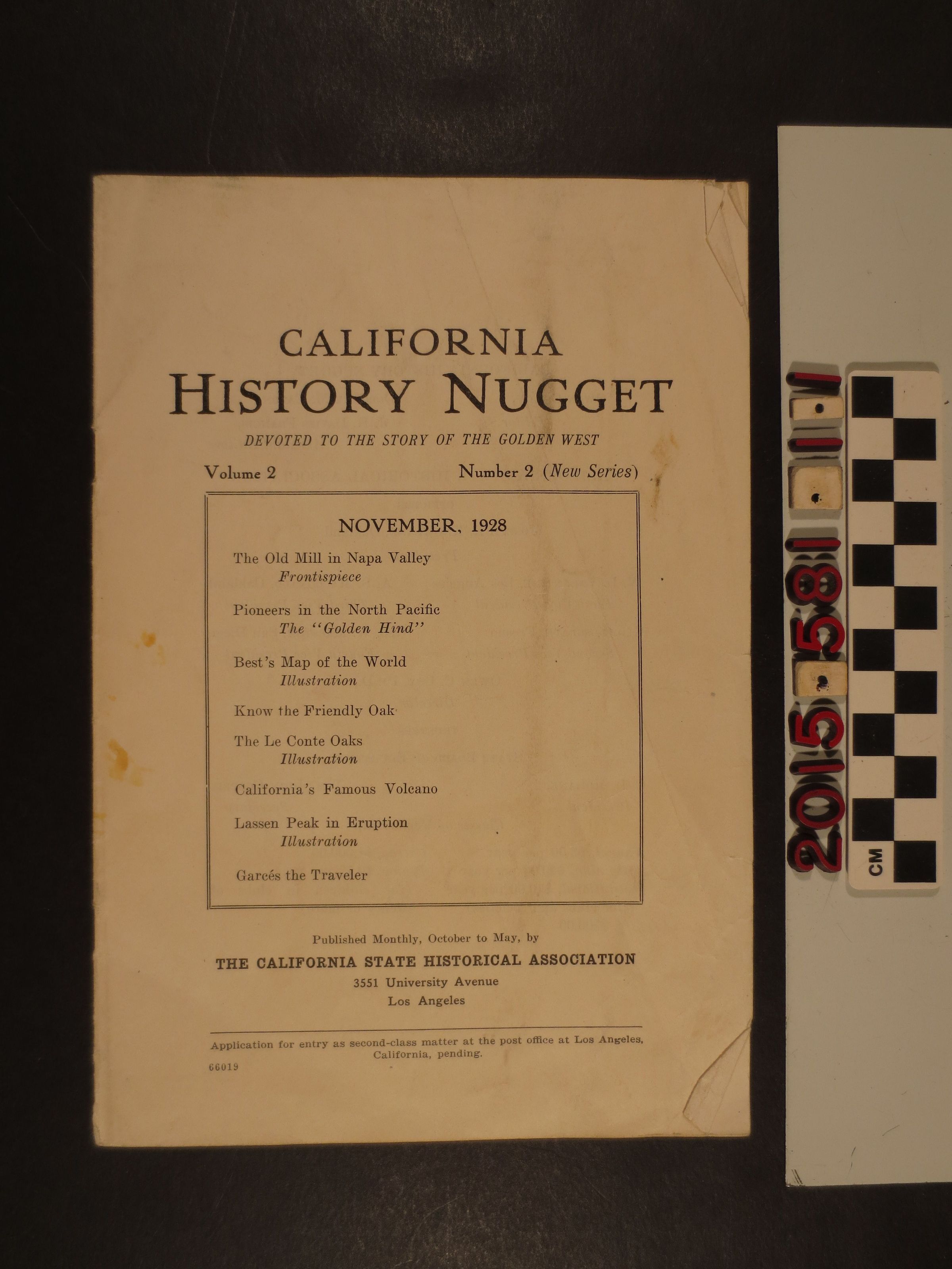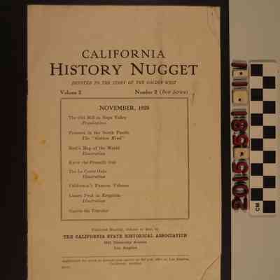 "California History Nugget," Volume 2, Number 2, November 1928. The publication is devoted to the story of the Golden West. This issue includes a photograph of the old mill in Napa Valley, story of the pioneers in the North Pacific, Best's map of the world, illustration of the Le Conte Oaks, article about California's famous volcano. The item was published by the California State Historical Associaiton in Los Angeles. The pamphlet is in fair condition with surface soiling, creasing and staining to the cover.Lexicon