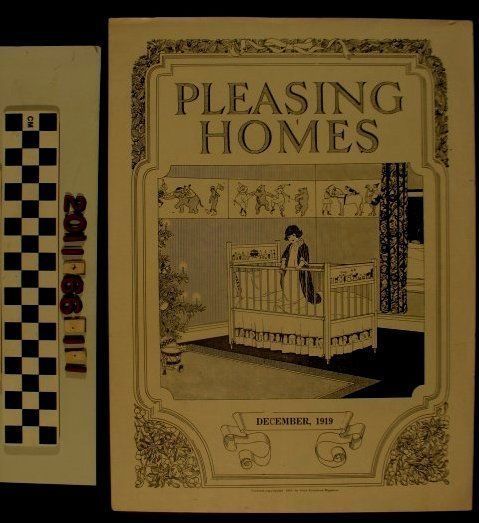 "Pleasing Homes," December 1919, from "Good Furniture Magazine" and published by Barker Brothers, Los Angeles. The item discusses furnishings and accessories for modern homes and contains an essay by Griffith T. Wells on Christmas shopping. There are some line drawings and photographic illustrations, while on the rear wrapper is a seasonal greeting by Barker Brothers. With some very light soiling, and edge rubbing and dents, the overall condition is good.