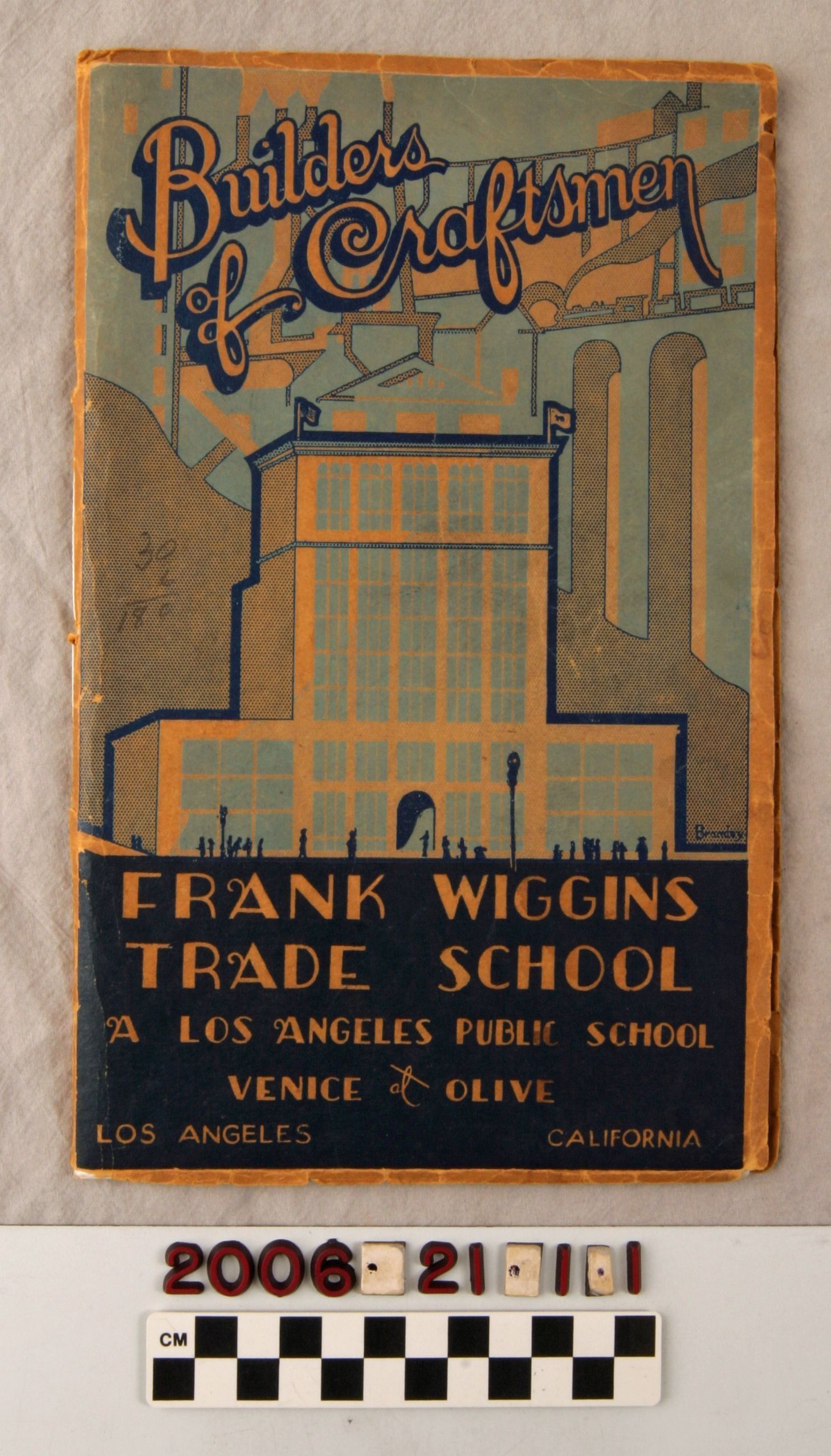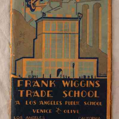 "BUILDERS OF CRAFTSMEN: FRANK WIGGINS TRADE SCHOOL, A LOS ANGELES PUBLIC SCHOOL," Los Angeles City School District School Publication No. 1858, June 1928. The item provides information on the many trades taught at the school as well as general school policy material. There are many photographs of school trade work as well as a list and photograph of faculty. The cover has much wear, especially tears and creases at the edges, but the text is in better shape, so the overall condition is fair.Lexicon