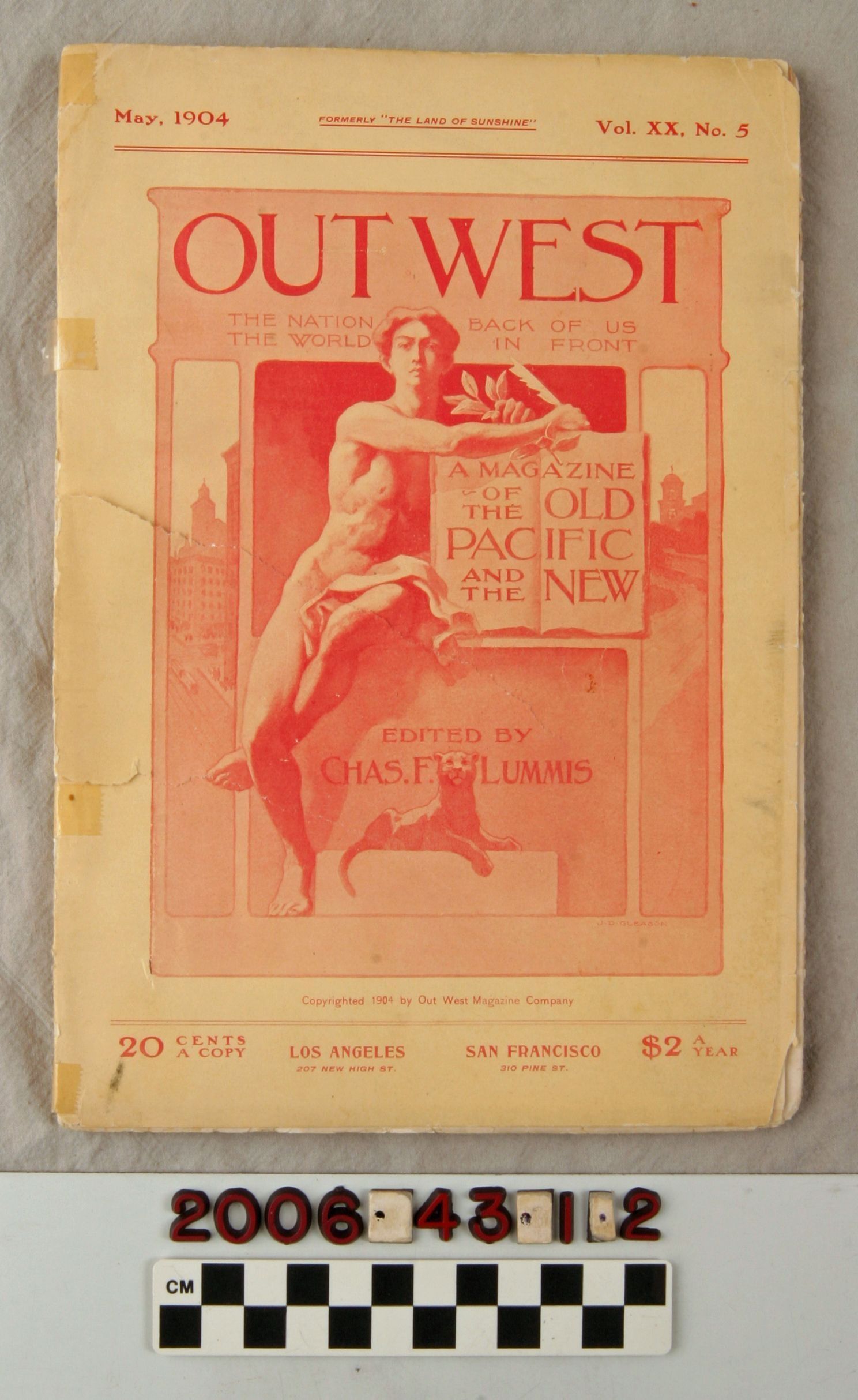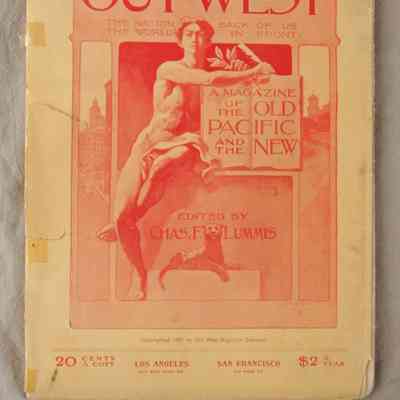 "Out West," Vol. XX, No. 5 (May 1904), published by Land of Sunshine Publishing Co., Los Angeles. The magazine, formerly known as "The Land of Sunshine," contains articles on the history of California and the West, travel articles, fiction and poetry, and others. There are illustrations and many area-related advertisements. With the front cover held to the text by tape, soiling, and wear to the covers, but clean pages, the overall condition is poor.Lexicon