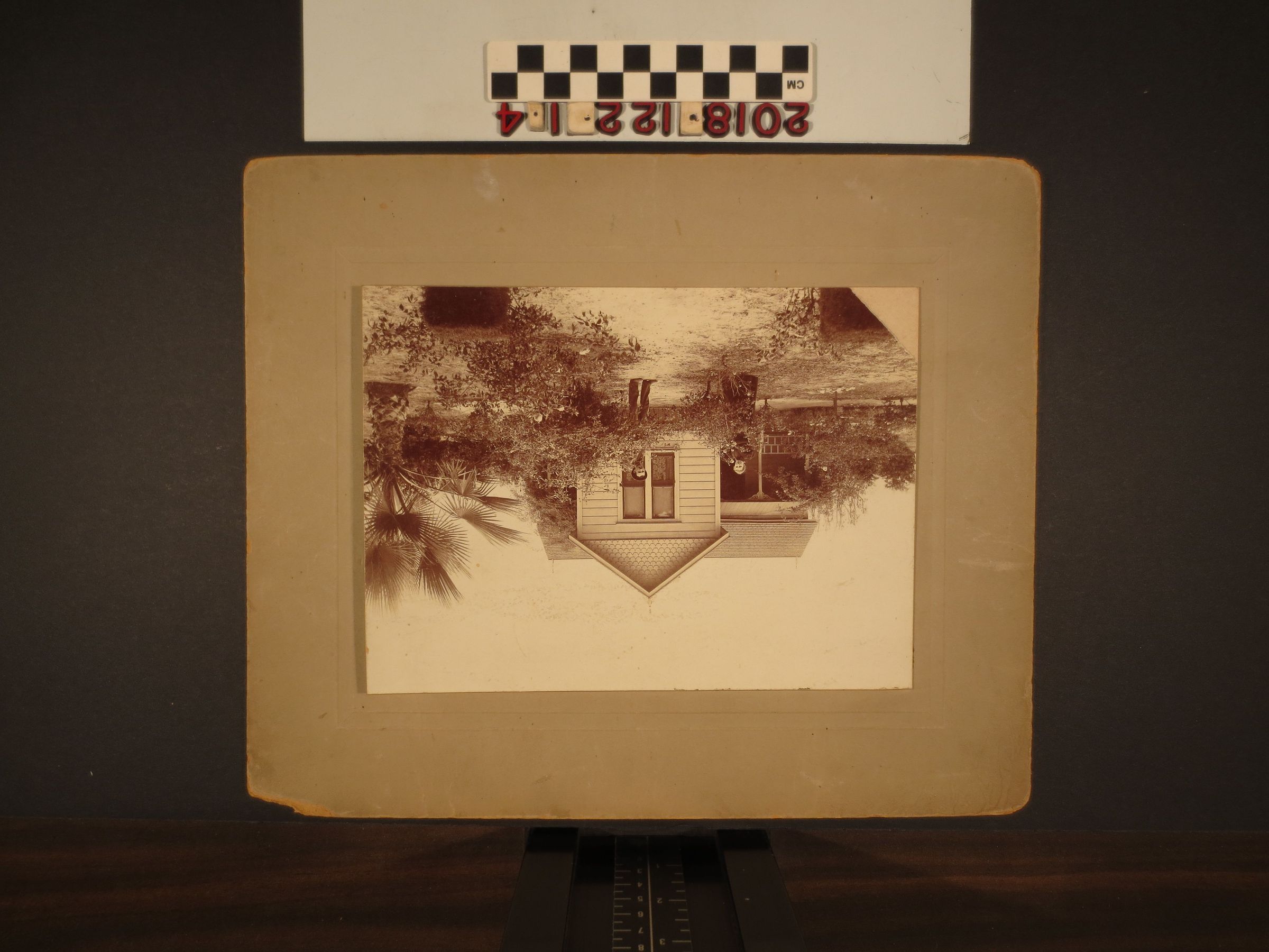 A cabinet card of "Ed and Frances Prathir / The first home. 19" in Los Angeles, California. ca. 1890s. The single storied home has a dirt path leading to the home, with shrubs and flowers on either side of the walkway. A man is standing in the center of the dirt path and a woman is standing behind a flower bush on the left side of the walkway. The bottom left of the image is missing, the top right corner of the card is missing, there is abrasion on all edges, and foxing, the object is in good condition overall.