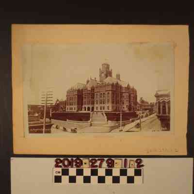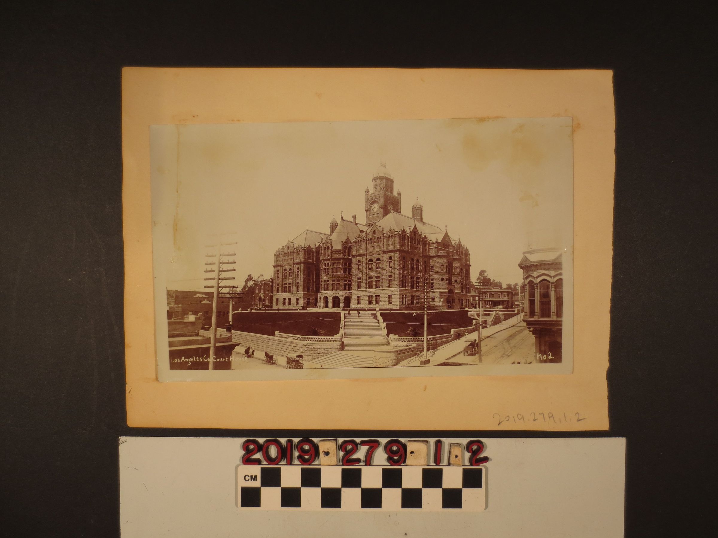 A photo album page with a photograph of court house, Los Angeles, California. ca. 1900s. The courthouse sits atop an elevated lot, and in view are steps leading to the front. The streets below show buggies being pulled by horses and pedestrians on the sidewalk. There appears to be an electric or telephone pole at the forefront, bottom, right. The image is labeled "Los Angeles Court House / No. 2" and object 2019.279.1.1 is on the back. With a tear on the bottom right and bottom left corner, foxing, stains, and discoloration from an adhesive, the object is in fair to good condition.