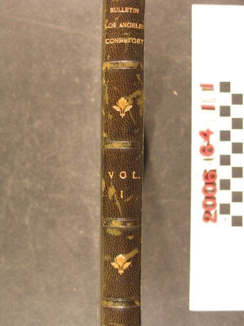 A bound volume of "Los Angeles Consistory Bulletin," Volume 1, September 1912-August 1913, published by The Bodies of the Ancient and Accepted Scottish Rite of Freemasonry in the Valley of Los Angeles. The item, consisting of monthly newsletters addressed from Long Beach, ask for material to be sent to the Scottish Rite Cathedral in downtown Los Angeles, with contents pertaining to the various consistories, or lodges, in the region. There are illustrations, lists of lodges and officers, and other information. While there are cracked hinges, edge wear, and other damage to the marbled cover, the contents are clean and the overall condition is fair.Lexicon