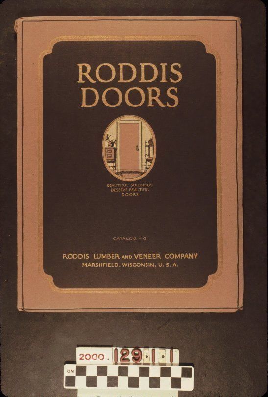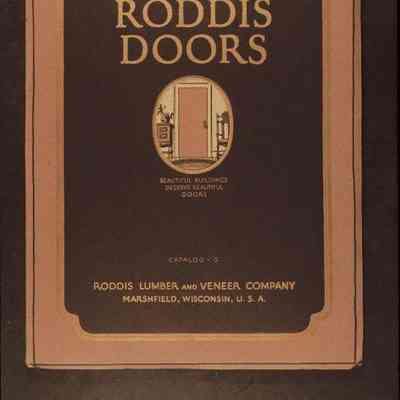 Catalog G, issued by the Roddis Lumber and Veneer Company, ca. 1920s. The 181-page artifact has a brown paper cover with a drawing of an interior door at center within an oval. Just below this are the words, "BEAUTIFUL BUILDINGS / DESERVE BEAUTIFUL / DOORS." Across the top is, "RODDIS / DOORS," and the catalog number and name of the company are at the bottom. All lettering is in gold ink. At the beginning are several articles dealing with the quality and construction of Roddis doors; a description and images of some of the buildings with the doors; and a product guarantee. There are many styles of interior and exterior doors available made with such wood as mahogany, oak, and walnut. At the back is a section entitled, "Construction Details of Roddis Doors." There are many black and white illustrations as well as some photographs. With light creases at the corners; dented corners; and tears on the top and bottom of spine, the object is in good condition overall.Lexicon