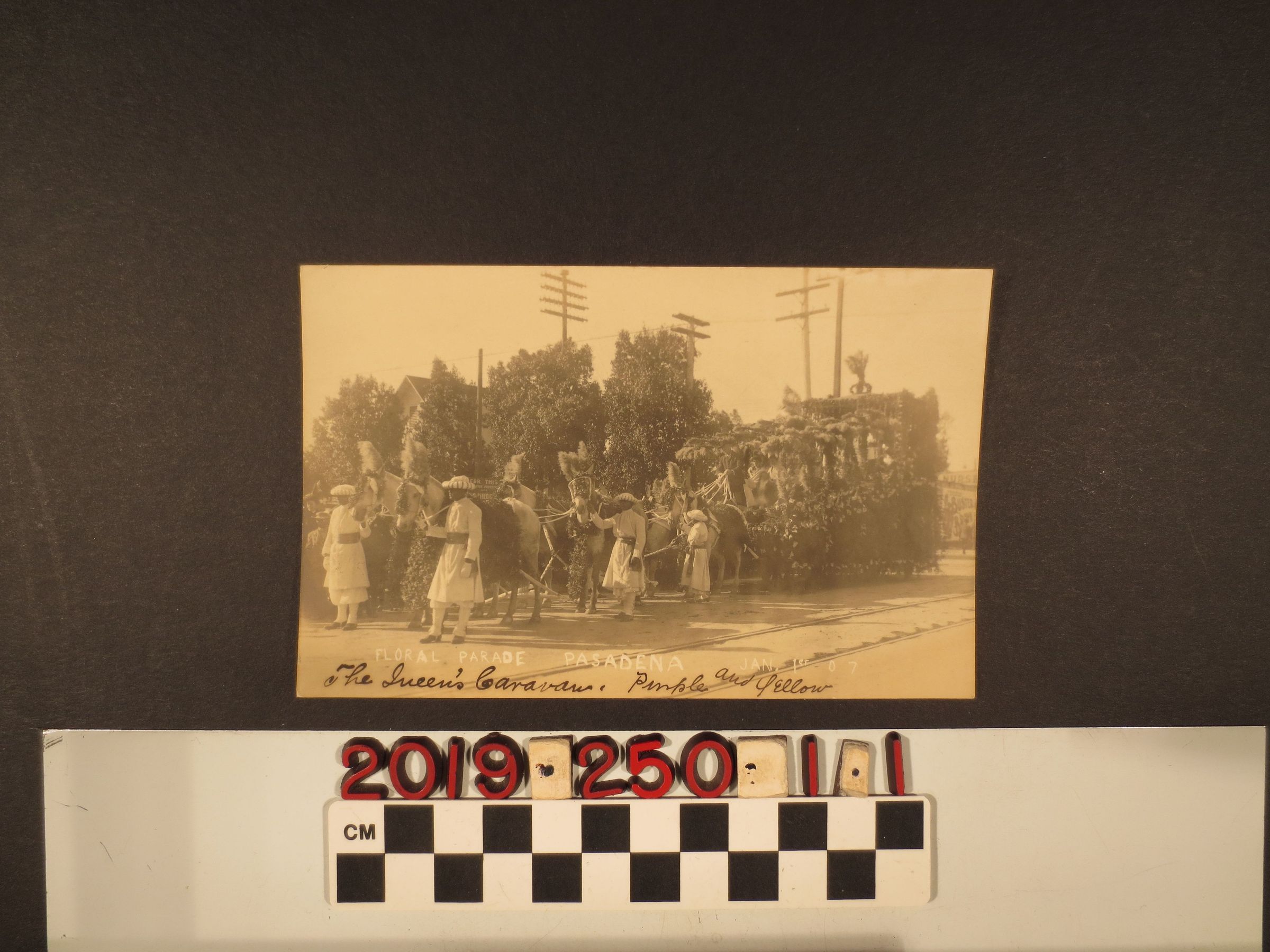 A real photo postcard of the Queen's Caravan, Pasadena, California. 1 January 1907. The float is decorated with flowers and vines.Young women are seated on the float and pulled by six horses as a man steers. A procession of men are seen walking next to the horses. The background shows a crowd of onlookers, electric powerlines and a residence. The bottom is labeled "Floral Parade, Pasadena, Jan. 1st 07. / The Queen's Caravan. Purple and Yellow." With moderate fading, abrasion damage on edges, and overall discoloration, the object is in fair condition.Lexicon