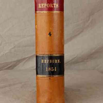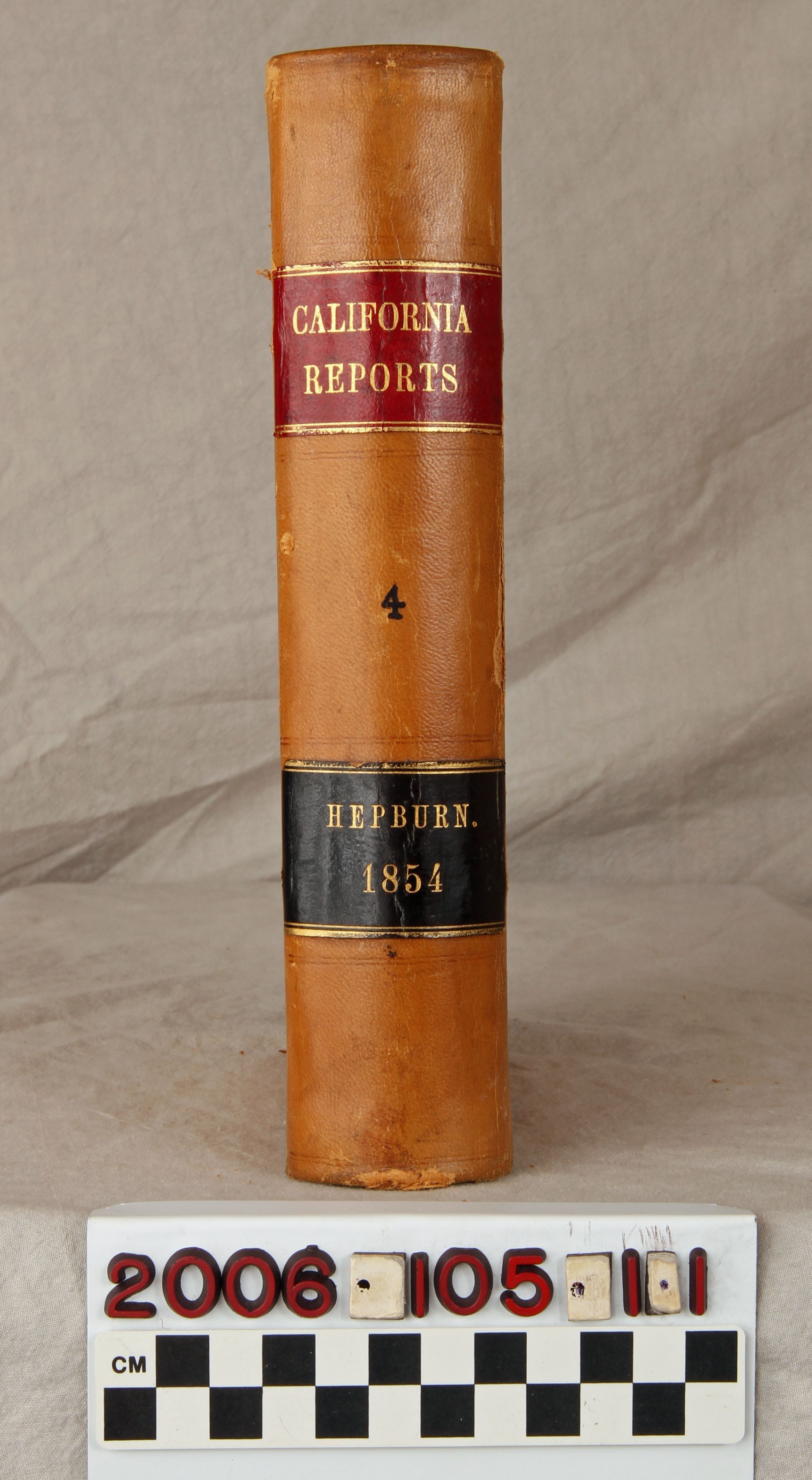 "California Reports," Volume 4, 1854 (2nd ed., San Francisco: Bancroft-Whitney Company,) 1887. The work contains the reported cases, as well as a list of justices and officers and an index . The covers have rubbing, abrasions, scratches, and soiling, while aside from browning, the pages are relatively clean and tight, so the general condition is fair.Lexicon