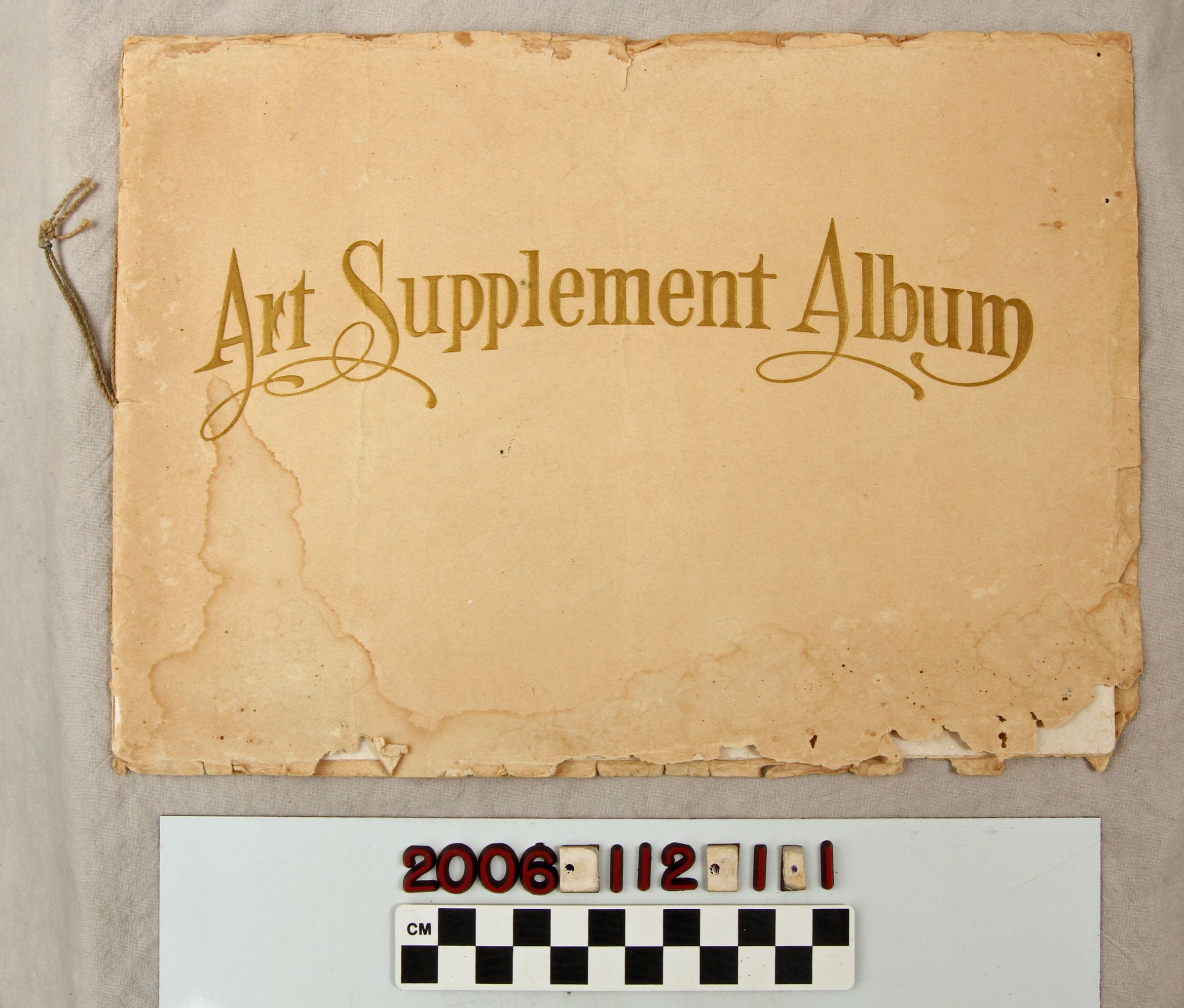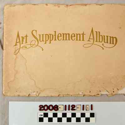 "Art Supplement Pictures: Views of Southern California," issued by Los Angeles Times, 1907. The view book contains black-and-white photographic views, mainly of natural scenes, in southern California, from the lower Sierra Nevada mountains to San Diego that appear to be reprinted from the newspaper's "Art Supplement" section. The covers are extensively worn with tears, stains, soiling, creases, pest damage and missing sections. There are liquid stains at the lower left of the images and some general soiling; the overall condition is poor.Lexicon