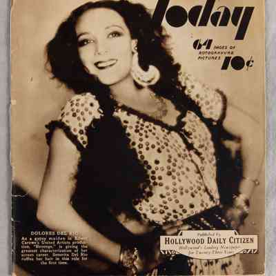 "Hollywood Today 1928," published by the "Hollywood Daily Citizen" newspaper, 1928. The cover features actress Dolores Del Rio and the item is essentially a rotogravure of the Los Angeles community and surrounding areas. While much is devoted to the motion picture industry, there are also significant portions devoted to general community news and developments. Significant damage or note includes tears, papaer brittleness, losses, loose cover, stains and tears making the artifact in fair condition.