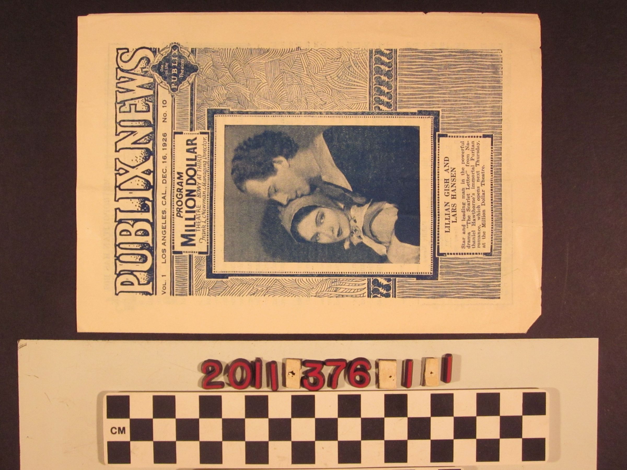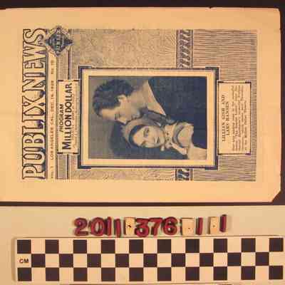 "Publix News," week of 16 December 1926. The item is a program for performances at the Million Dollar Theater in Los Angeles and has a cover image of actors Lillian Gish and Lars Hansen from "The Scarlet Letter." There is an editorial from Frank L. Newman, managing director of the theater, news from the sister Metropolitan Theater, material on the upcoming showing of "The Scarlet Letter," and the program for the week, featuring a Wallace Beery film, "We're in the Navy Now." With a vertical fold, small edge tears, light soiling, and some creases, the overall condition is good.