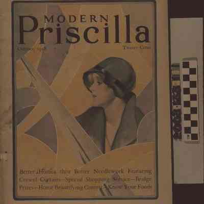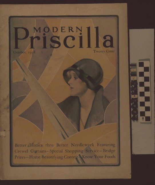 "Modern Priscilla," October 1928 issue, published by The Priscilla Company, Boston. The front cover has the title, month and year, and price of the issue at the top. At the center is a color image of a woman in purple clothing amidst a variety of geometric shapes in purple, blue, and green. At the bottom right are the subjects of five articles in the issue. Articles include fiction; needlework curtains; bedspreads; cloth picture books for children; Art Deco needlework for the kitchen; chain-stitched items; felt trim pillows; food recipes; interior decoration; gardening; nurseries; furniture refinishing; children's clothes; milk and nutrition; Halloween party planning; buying meat; and women's fashions. There are many black and white and a few color illustrations and many advertisements throughout. A table of contents is at the rear of the 72-page periodical. At the upper left corner of the front cover is a stamp recipient's address. In fair condition, the item has spine brittleness; cover creases, soiling, loose covers, a small portion of the bottom right corner of the front missing, stains, especially on the front, and tears, while there is some light page discoloration.Lexicon