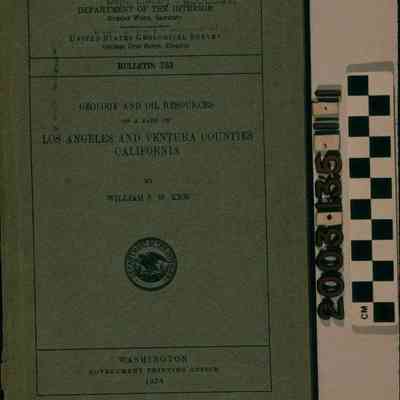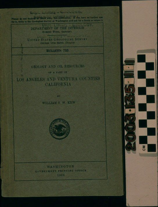 "Geology and Oil Resources of a Part of Los Angeles and Ventura Counties California," Bulletin 753 issued by the U. S. Geological Service, by William S. W. Kew (Washington: Government Printing Office,) 1924. The item is bound in a blue paper cover with the names of the government Department of the Interior and United States Geological Survey and their heads at the top, the bulletin number beneath this, the title and author's name, as well as the seal of the Interior Department at the center, and the printer's name, location, and the publishing year at the bottom. On the spine are the title, author's name, and the names of the Geological Survey and Interior Department. The back cover is missing. Contents include an introduction; acknowledgements; geography; climate and vegetation; stratigraphy; , which is subdivided into many sections relating to formations in the areas covered; structures; and petroleum, including its origin, accumulation, surface evidences, and occurrence and future possibilities in a variety of sections within the covered area. There is also an index and seventeen plates, the first two of which are missing, and seven figures. The covered area includes northwestern Los Angeles and northeastern Ventura counties, including the Santa Clara Valley and the old San Fernando district near present Santa Clarita, where F. P. F. Temple had wells in the early 1870s. There is a library stamp at the top of the front cover. With cover creases, dents, stains, and tears; the missing back cover; a heavily damaged spine; and yellowing of pages, the overall condition is fair.Lexicon
