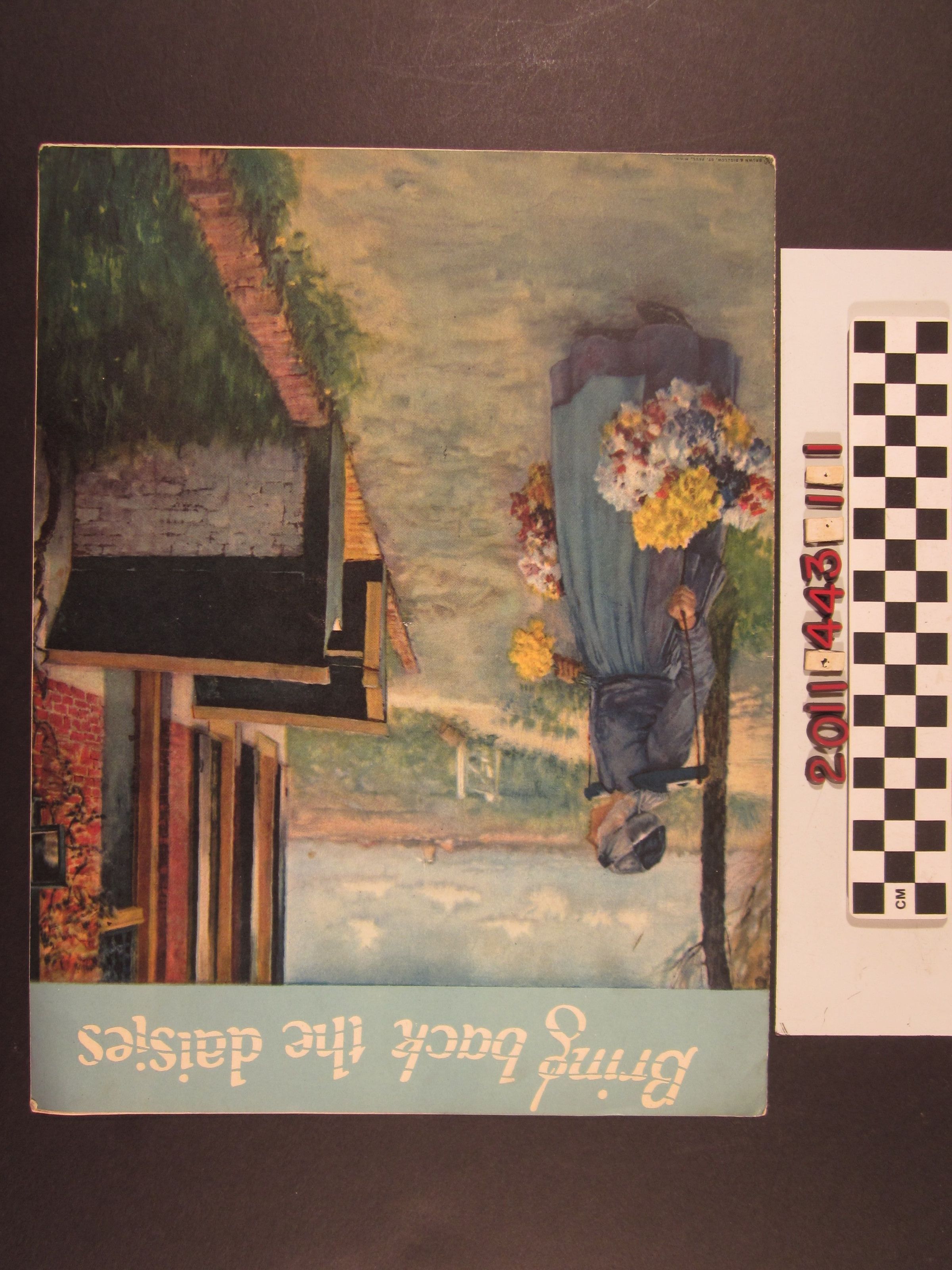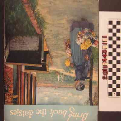 "Bring Back the Daisies" by Harley Russo, published by the McClure Publishing Company, Los Angeles, 1927. The front cover has an image of a woman carrying baskets of daisies on a device on her shoulders. She also has a bunch in her left hand and stands in front of a brick structure near open fields. The score in a valse or waltz tempo. The song was first published in Ohio in 1920 and transferred to McClure in St. Paul, Minnesota the following year and then to the firm in Los Angeles in 1927. A sample score for a "novelty rag" called "Chimes" is at the back and an ad on the back cover for more Russo-penned songs offered by McClure. With a few stains, soiling and rubbing, the overall condition is good.Lexicon