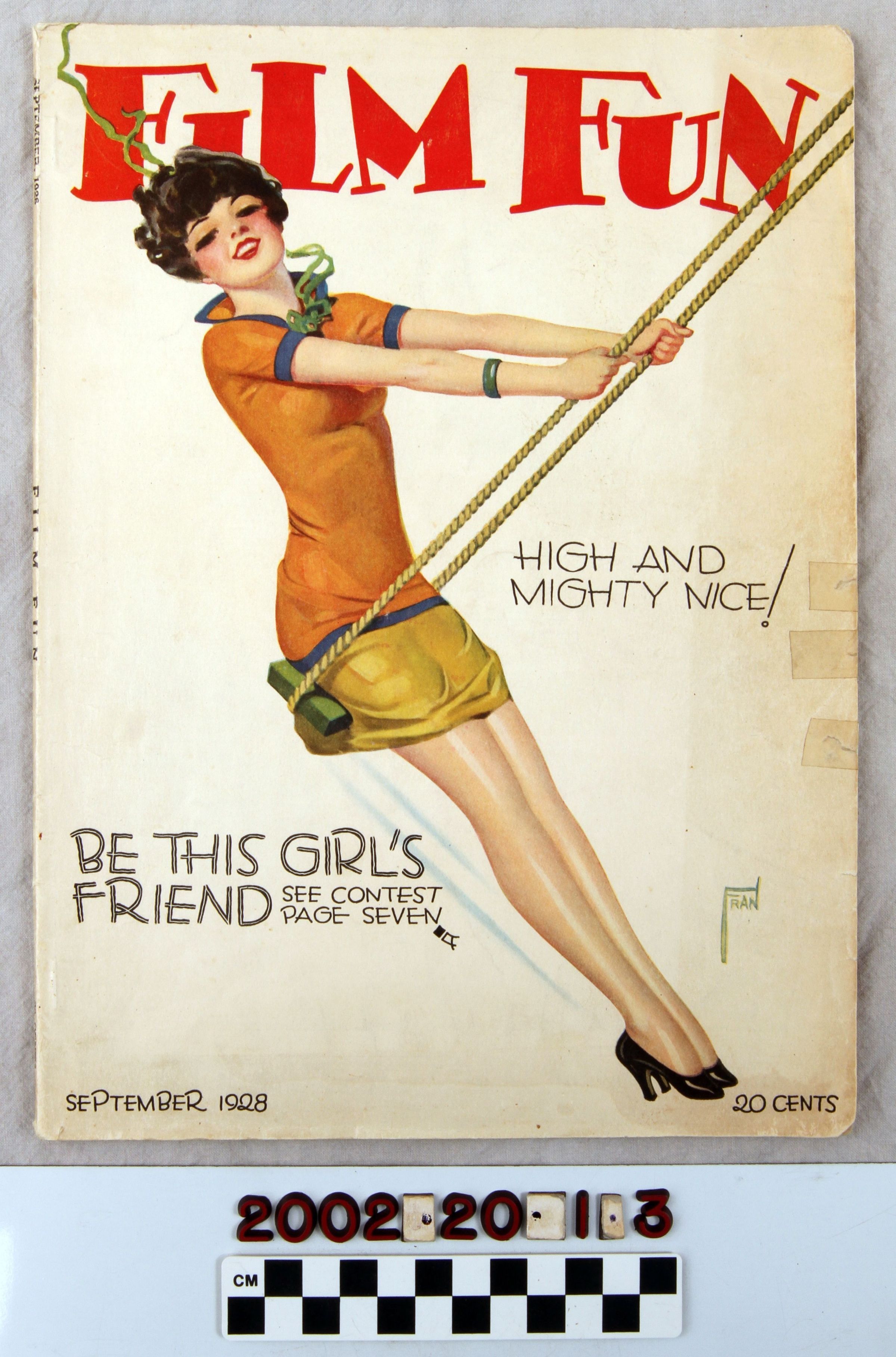 "Film Fun," September 1928. The magazine has 64 pages and the title in red across the top of the front cover. At the center is a color illustration of a woman on a swing with the caption "HIGH AND / MIGHTY NICE!" She has short black hair and wears an orange colored top, a short yellow skirt, and black heeled shoes. The date and the price are on the bottom corners in black. The issue contains many photographs of actors on the set as well as articles on the latest news from Hollywood; film reviews; character actors; updates on the industry's most popular stars; gossip; and more. With some light creases; some soiling; darkening of the pages; a missing page which contained the table of contents and publisher information; pen markings; a musty smell; small stains; tarnish on the staples; small tears; and some wear, the artifact is in overall fair condition.Lexicon