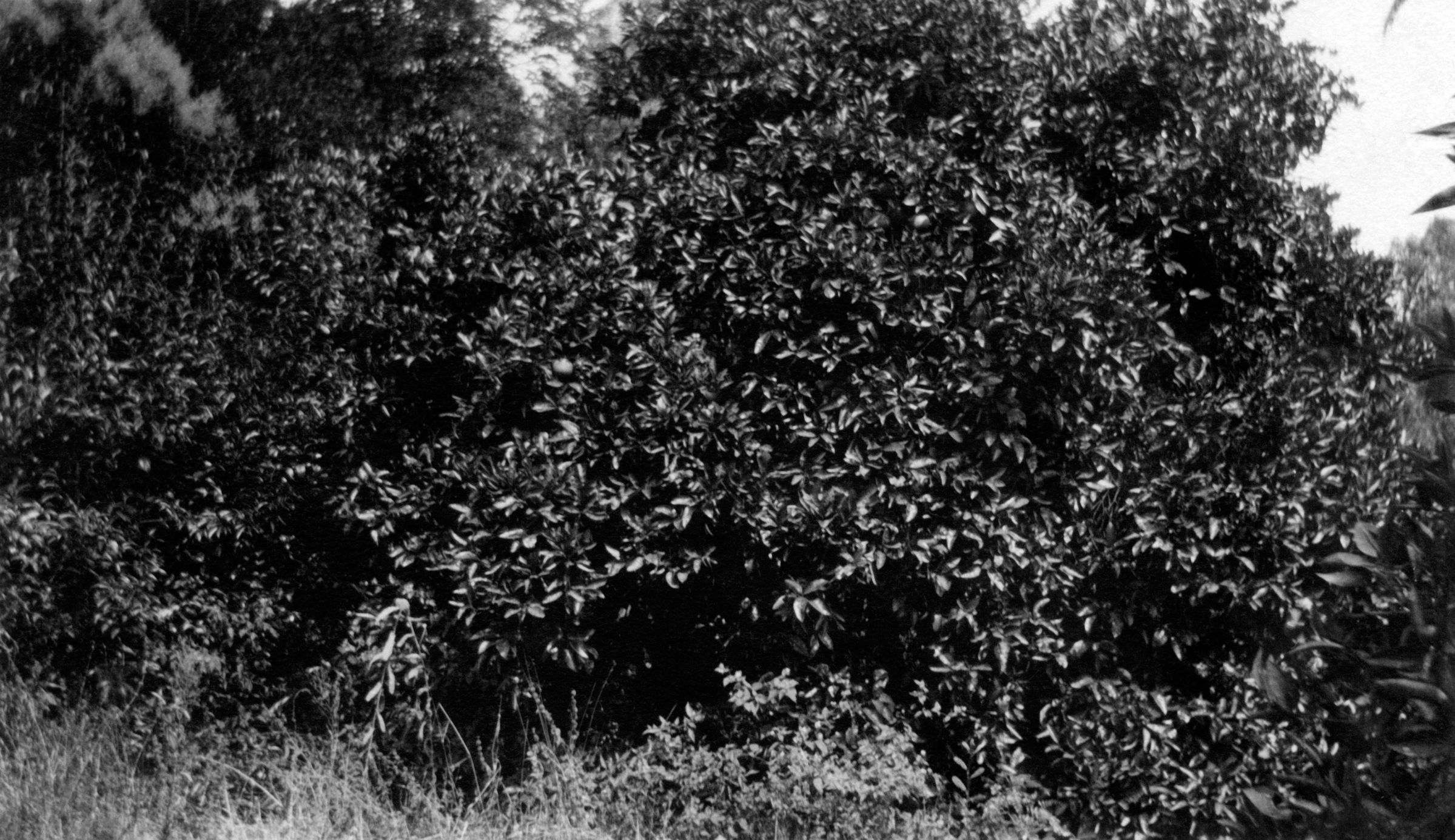 "Grapefruit, Hollywood, California", 1920s. The image is a close-up view of some trees, perhaps a couple. On the reverse is an inscription: "Grape Fruit Trees, Laughlin / Park Hollywood, California." With some mounting corner residue and slight soiling, the condition is fair.Lexicon