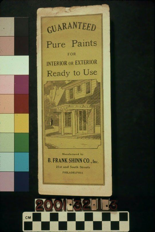 "GUARANTEED PURE PAINTS FOR INTERIOR OR EXTERIOR" Color: Black; Green; White "Guaranteed Pure Paints for Interior or Exterior," issued by B. Frank Shinn Co., Inc., ca. 1920s. The brochure is of white paper with the title at the top of the green front cover. Below the title are the words, "Ready to Use." At the center is a line-drawing of a two-story home with a path across the front on which a man and woman walk. At the bottom is the name and address of the manufacturer, and all of the printing is in black ink. On the back are claims and guarantees of the product's quality and durability. Inside are directions for surface preparation, paint application, and indications of the amount of paint needed for certain jobs. Twenty-four color paint samples are also provided and include such colors as battleship gray, Spanish brown, snuff brown, Napoleon green, and more. With abrasions; creases; darkening of the paper; heavy soiling; acid burns; and tears, the object is in poor condition.