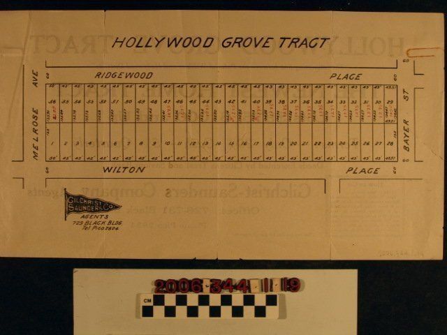 "Hollywood Grove Tract," published by Gilchrist Saunders Company, 1920s. The map covers an area bounded by Melrose Avenue on the south, Bayer St. (now Lemon Grove Avenue) on the north, Wilton Place on the east, and Ridgewood Place on the west. There are lot numbers, measurements of depth and width, some prices for lots written in ink, and contact information for the developer. On the reverse is some text about the tract, including prices, terms, developer contacts, and directions by streetcar. A business card from the tract agent, item .20 of the accession, was affixed with a paper clip, so, with rust from the clip, original folds, several tears along folds, and some creases, the condition is fair.Lexicon