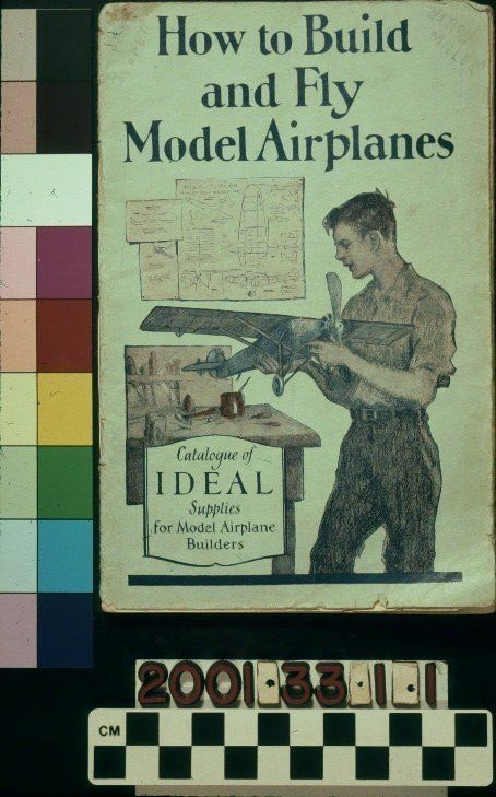 "How to Build and Fly Model Airplanes," issued by the Ideal Aeroplane & Supply Co., Inc., 1928. The 64-page catalog has a light-blue paper cover with the title at the top of the front. Written in pencil on the top left corner is "ALBERT / COOPER," while on the opposite corner is, "HARRY / MILLER." At the center is a blue and brown drawing of a young man in slacks and a short-sleeve shirt who stands by a work table. In his hands he holds a biplane model. Within a shield on the bottom left is, "Catalogue of / IDEAL / Supplies / for Model Airplane / Builders." On the back is an illustrated advertisement for the products with text that provides reasons for model-building. All of the printing on the covers is in dark blue. At the beginning of the inside are a title page; table of contents; index; and articles on the history of aviation, airplane types, and learning about aeronautics through model-building. There are a variety of model kits listed for such airplane types as sea, French Scout, Fokker, gliders, and more. Miniature radiators, wheels, propellers, liquid cement, and other parts and supplies are also listed. The artifact is fully illustrated with line-drawings and some black and white photographs. With many abrasions; brittleness; creases and dents; discoloration; soiling; stains; and tears, the object is in poor condition.Lexicon