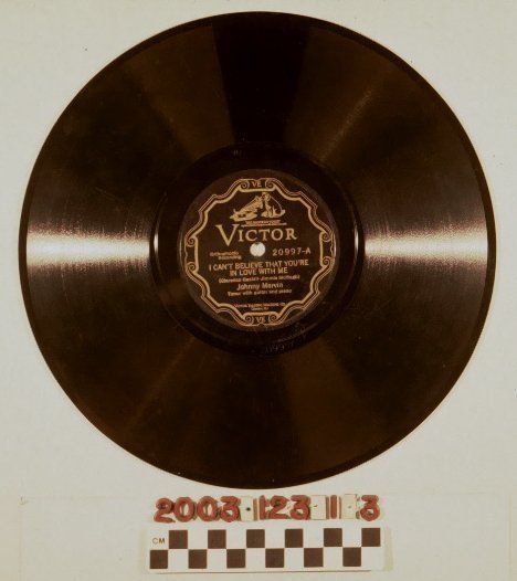 A 78-rpm recording including "I Can't Believe that You're in Love with Me" written by Clarence Gaskill and Jimmie McHugh and performed by Johnny Marvin and "That Day in June" written by Henry Tobias and Irving Mills and performed by Jim Miller and Charlie Farrell and issued by the Victor label, 20997-A and B, 1928. The label has a scroll-patterned border with the letters "VE" at the top, the logo of the company, showing Nipper the dog listening through a victrola's horn, the label name, the identification number, song title in English and Spanish, the songwriters' names, artist, and company name and city of business. Side A features Marvin, a tenor, with a guitar and piano accompaniement, while side B is a duet with a mandola, guitar, and lute accompaniment. In good condition, the item has light grime on the grooves and some scratches on the grooves and label.Lexicon