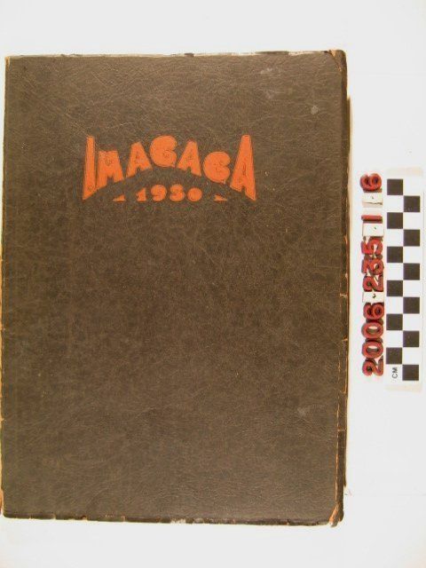 "Imagaga," Puente Union High School yearbook, Puente, California, 1930. The item has such contents as dedications, forewords from the editor-in-chief and school administrators, a list and photographs of the faculty, list and photographs of the classes, review of organizations, activities, sports, literary, and a humor section, all well illustrated. There are also many area advertisements and student notes and signatures. With fading, edge wear, some binding separation, and soiling to the wrappers, but pages generally clean, the overall condition is fair.Lexicon