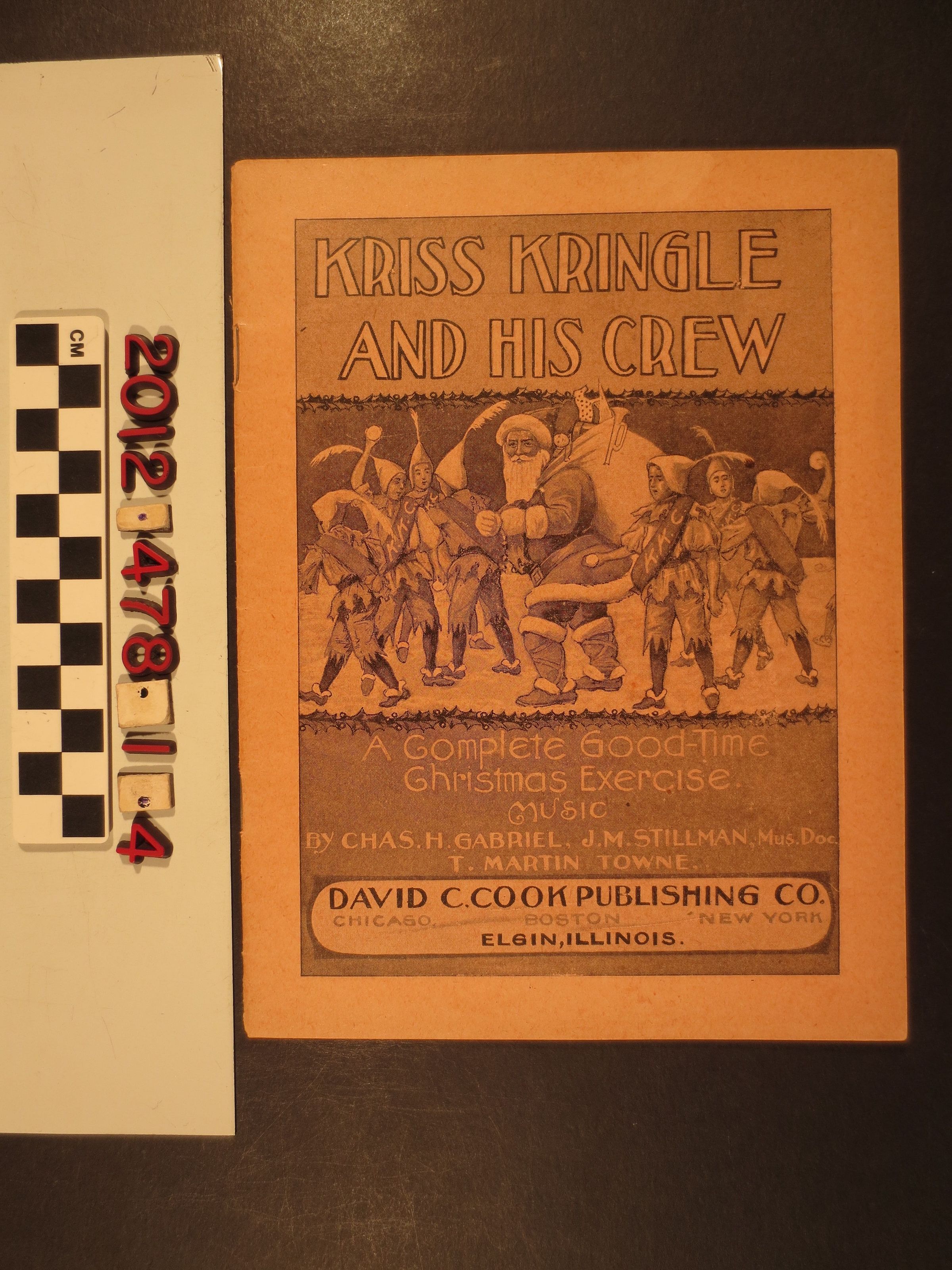 "Kriss Kringle and His Crew," a Christmas cantata published by David C. Cook Publishing Company, Elgin, Illinois, 1905. The work has music by four men "and others" and includes the songs, texts and stage directions for the performance. On the back cover are a list of holiday cantatas, including ones for Easter, Children's Day, and others. With some soiling and browning on the wrappers and pages, the condition is good.Lexicon