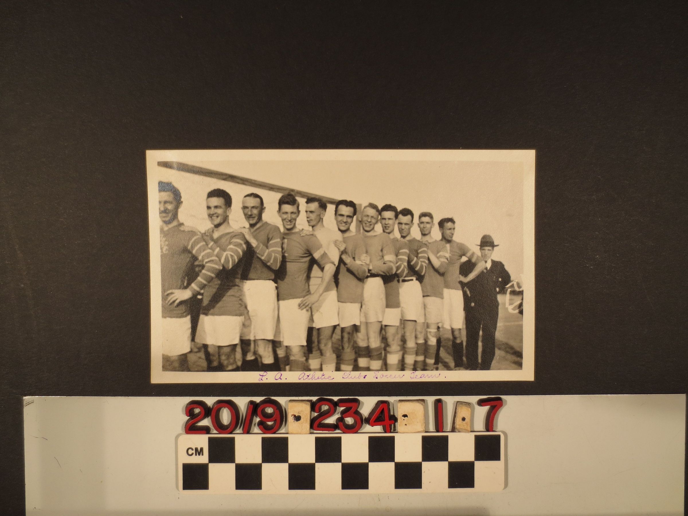 "L.A. Atheltic Club Soccer Team," Los Angeles, California. ca. 1910s. A team of eleven soccer players are lined up in a row, wearing their uniforms. Another man wearing a suit, tie and hat is standing at the end of the row. There is a soccer field to the right and a goal in the background. With adhesive residue on the four corners, minor mirroring, the object is in good condition overall.
