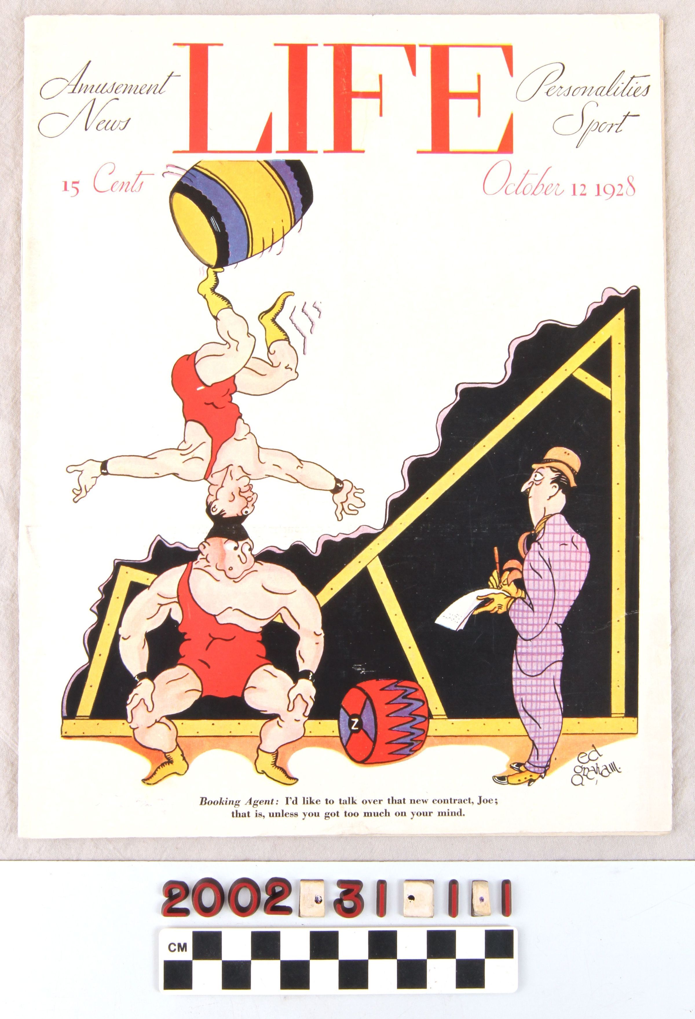 Color: Black; Purple; Red; White; Yellow "Life," published by the Life Publishing Company, October 12, 1928. The magazine has 40 pages and the title at the top of the front cover in red. At the left of the title in black is "Amusement / News," while at the right is "Personalities / Sport." At the center is a color illustration of two acrobats in red leotards. One of the acrobats balances himself on the head of the other while juggling a barrel on the toes of his left foot. At the right of the acrobats is a man in a yellow hat and purple suit. A caption in black at the center of the bottom reads "Booking Agent: I'd like to talk over that new contract, Joe; that is, unless you got too much on your mind." The issue includes many articles, including one in support of the Democratic party written by Will Rogers, and other stories on politics; sports; theater; American culture; news; current events; and more. Many political cartoons, drawings, and advertisements are also in the issue. In good condition, the artifact has only light creases, light soiling, and small stains on the cover.