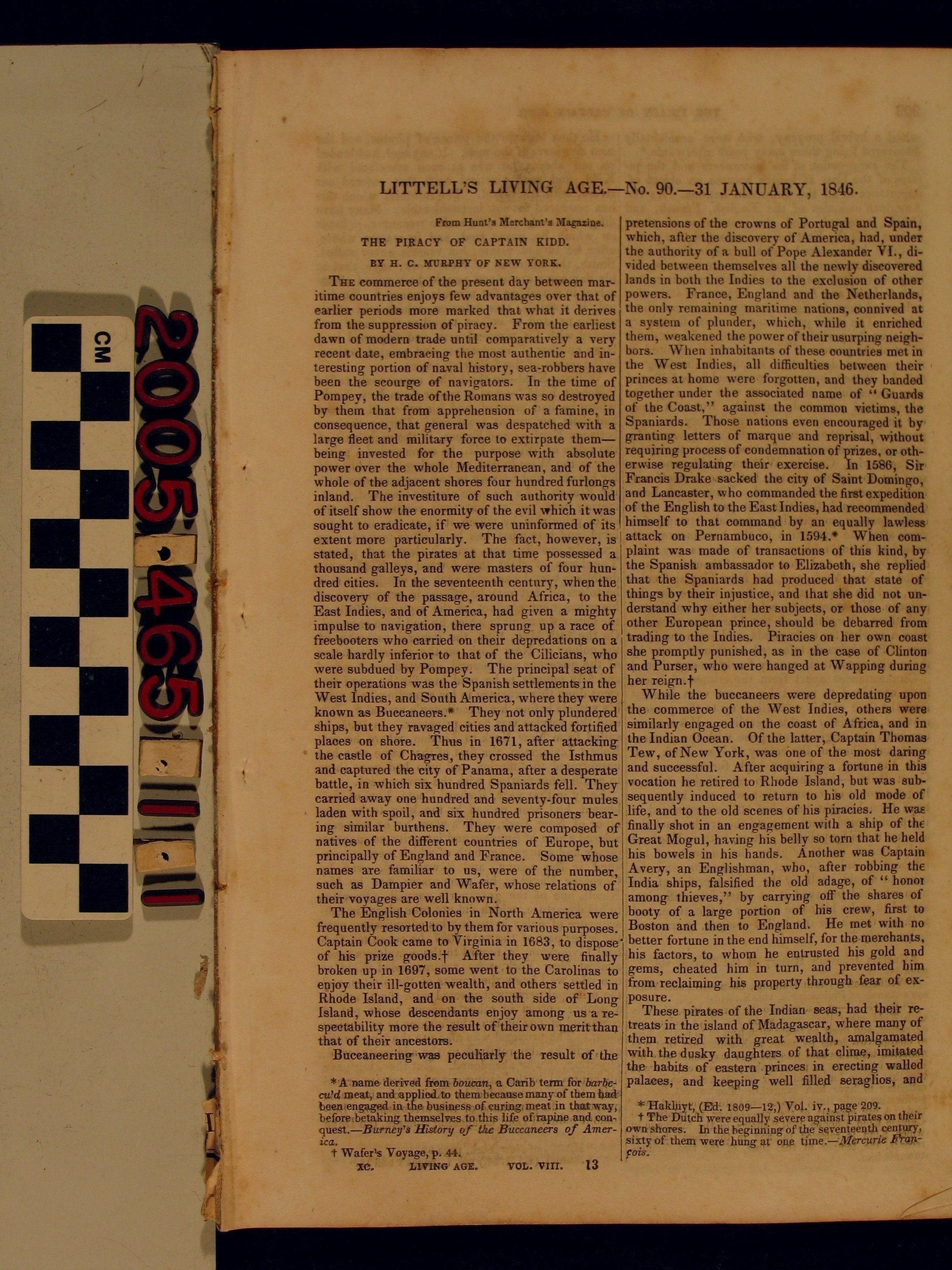 PERIODICALS, "LITTELL'S LIVING AGE," Number 90, 31 January 1846. The disbound item, containing forty-seven pages, contains a lengthy article from pages 208-19 on California, reprinted from the journal "The American Review." The other main articles concern Captain Kidd's piracy and the life and writings of John Jay. With some foxing, dogeared corners, and a few creases, the overall condition is good.Lexicon