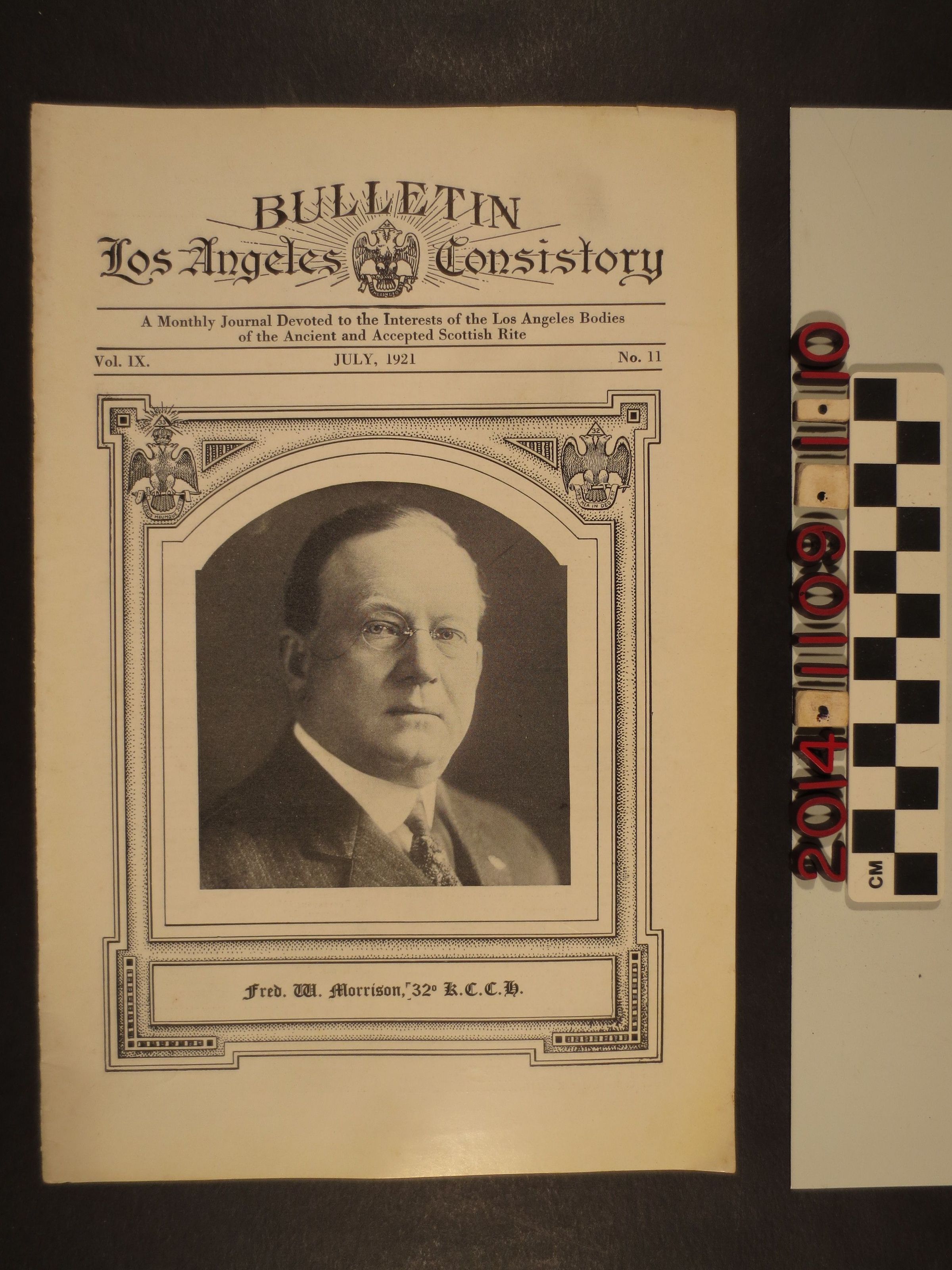 "Los Angeles Consistory Bulletin," July 1921. A monthly journal devoted to the interests of the Los Angeles bodies of the ancient and accepted Scottish rite of Freemasonry. A twenty page pamphlet containing some organizational history, news about members and the organization. The pamphlet is in good condition with minor surface soiling.Lexicon