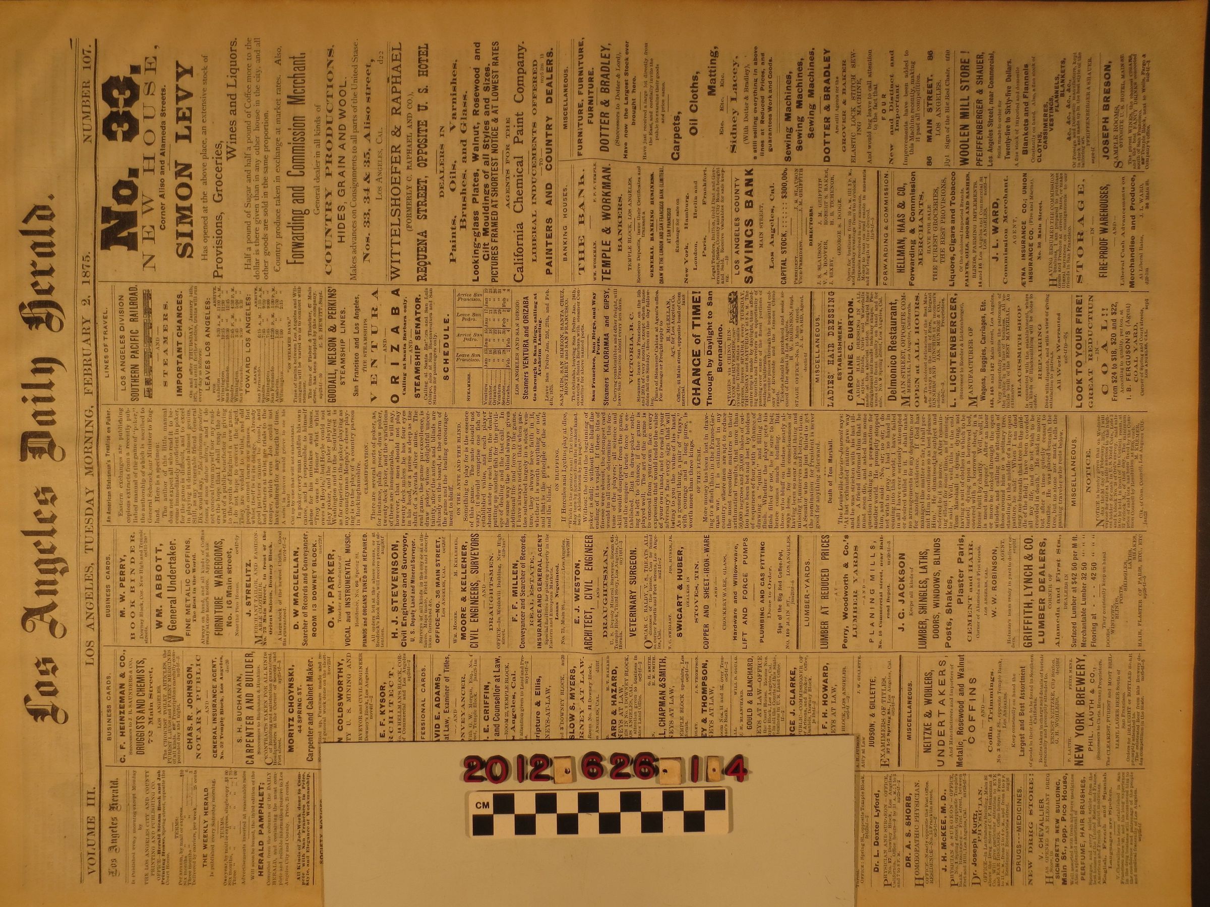 "Los Angeles Daily Herald," 5 February 1875. The overall condition is fair.Lexicon