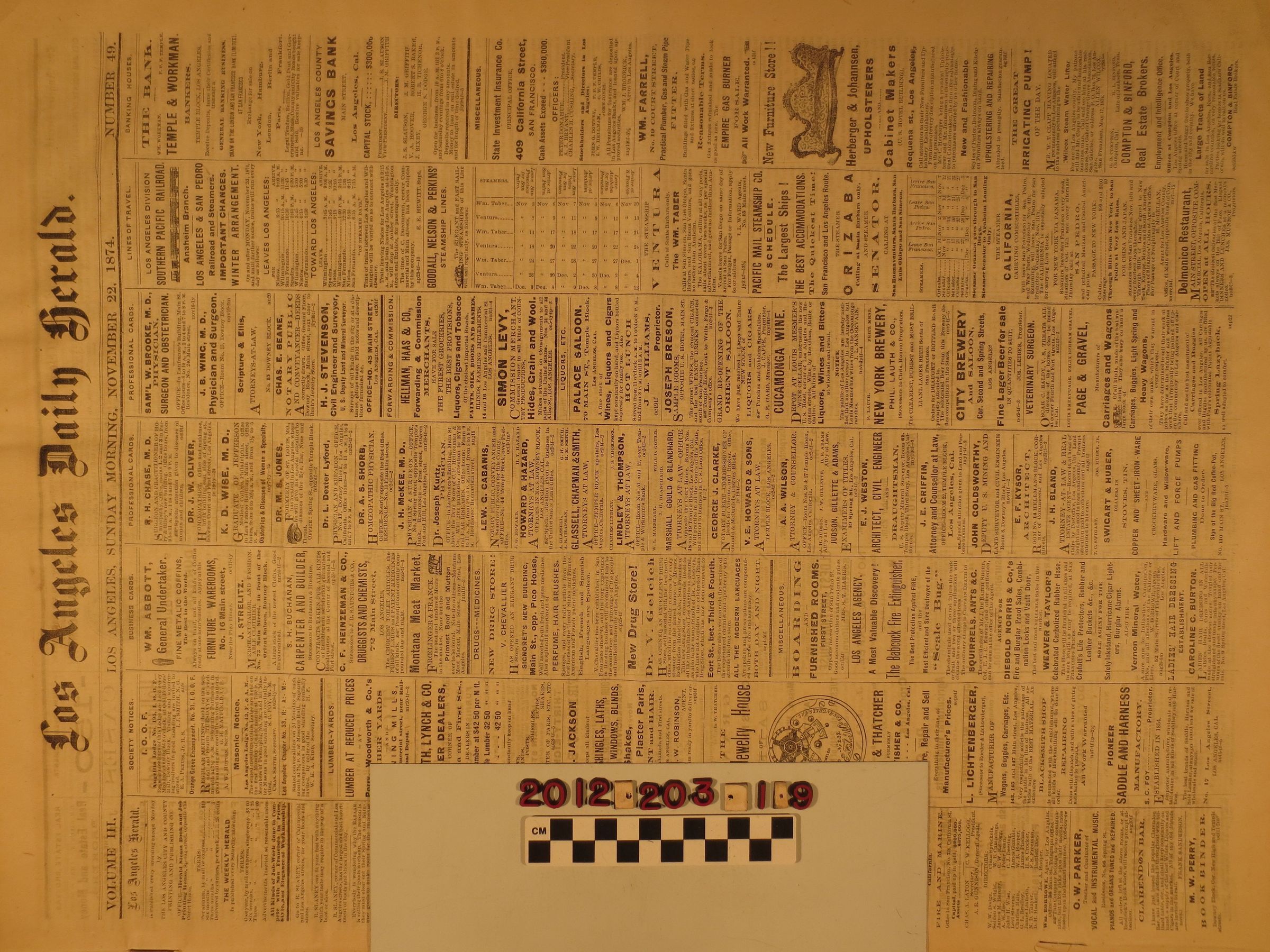 "Los Angeles Daily Herald," 29 November 1874. The overall condition is fair.