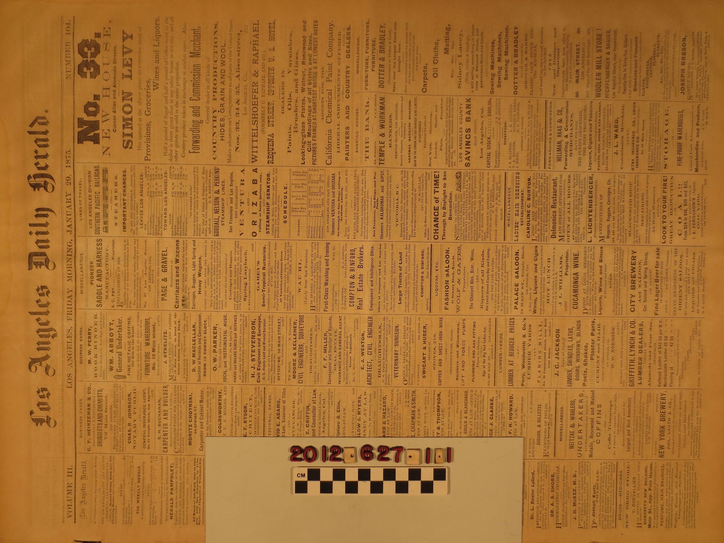 "Los Angeles Daily Herald," 29 January 1875. The overall condition is fair.Lexicon