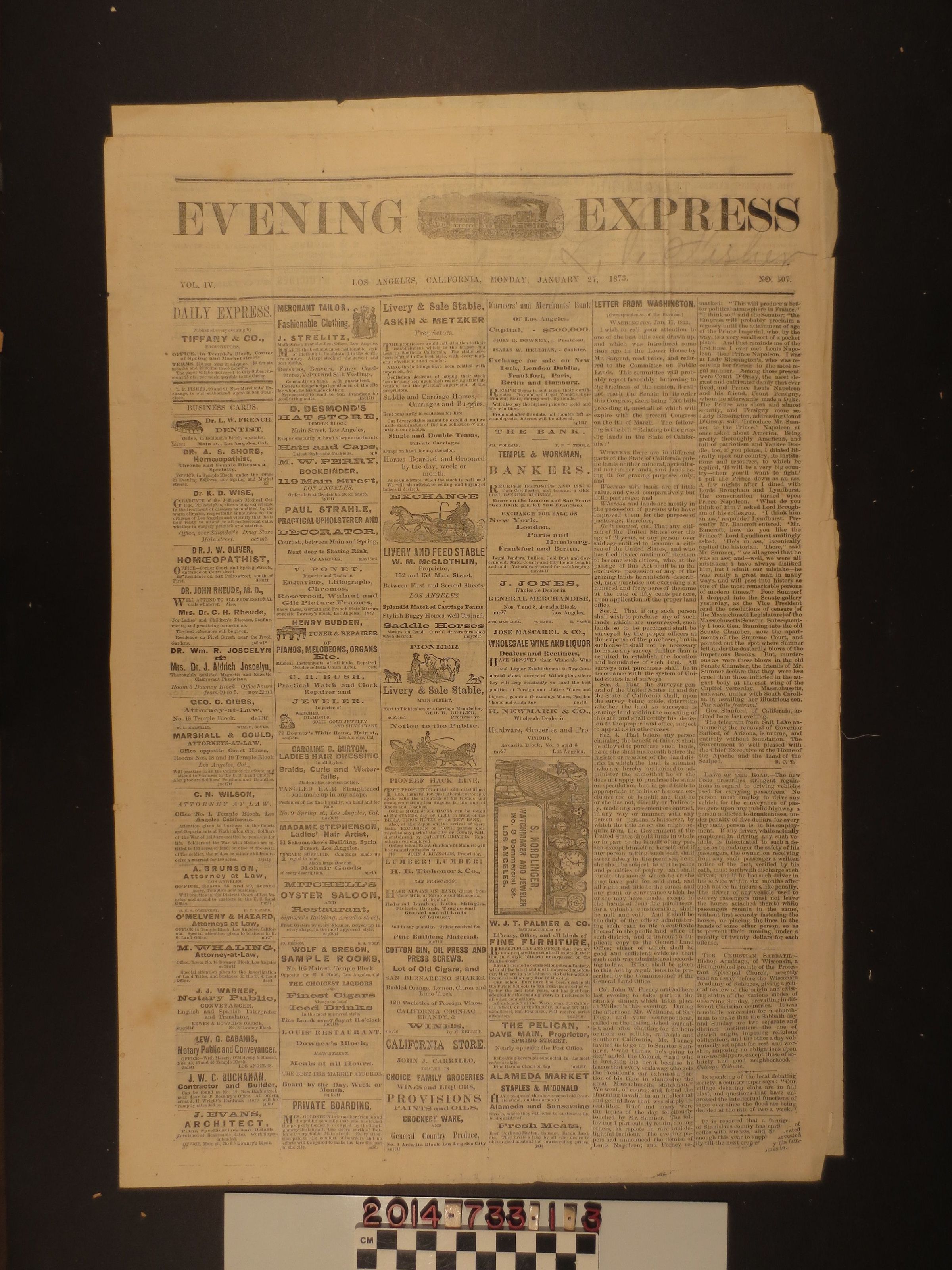 "Los Angeles Evening Express," 27 January 1873. A daily publication from Los Angeles featuring mostly advertisements, notices and announcements. Includes an article about a new bill from Washington regarding the grazing lands of California. The newspaper is in good condition with edge tears and minor surface soiling.