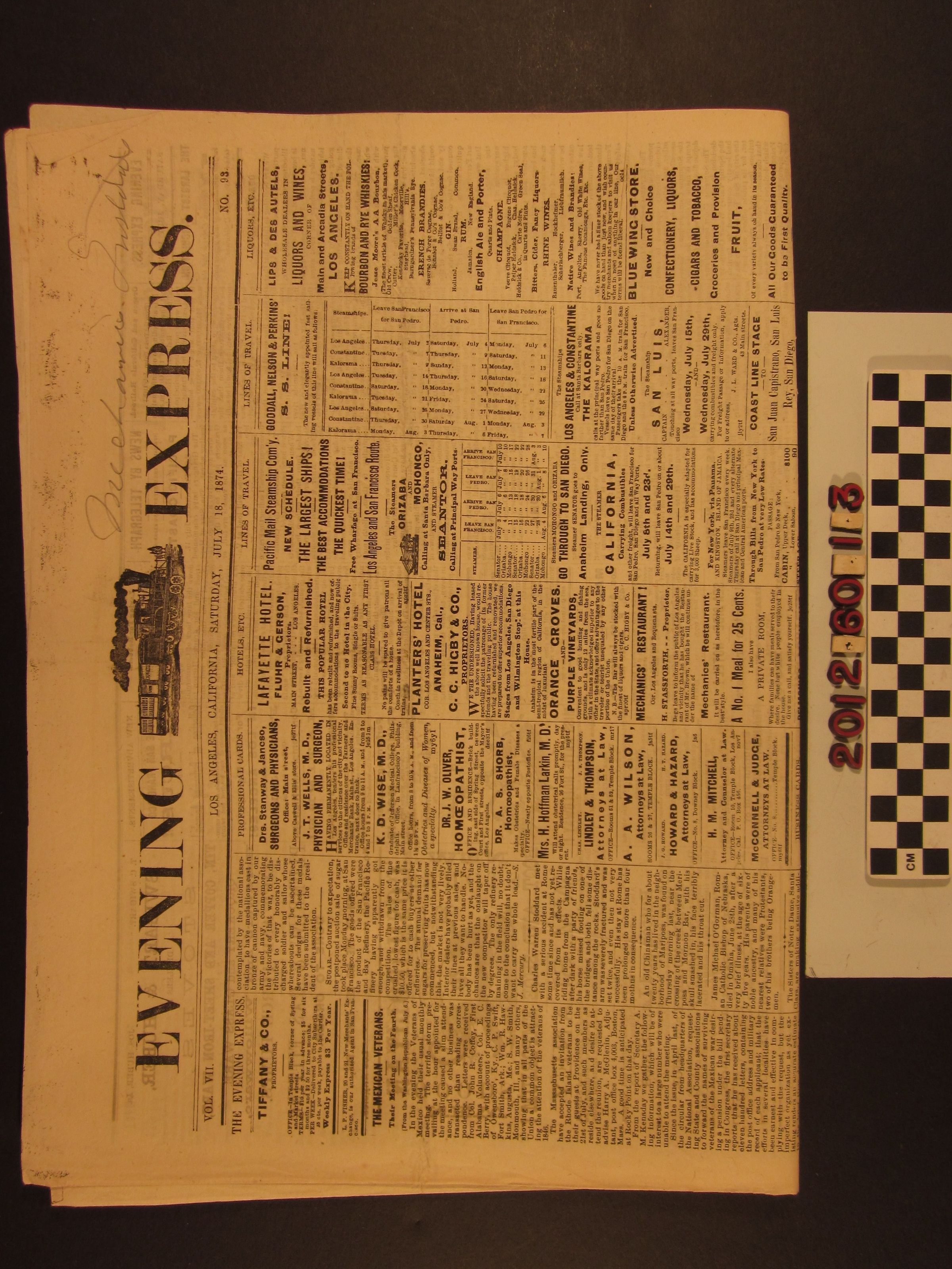 "Los Angeles Express," 18 July 1874. The condition is good.