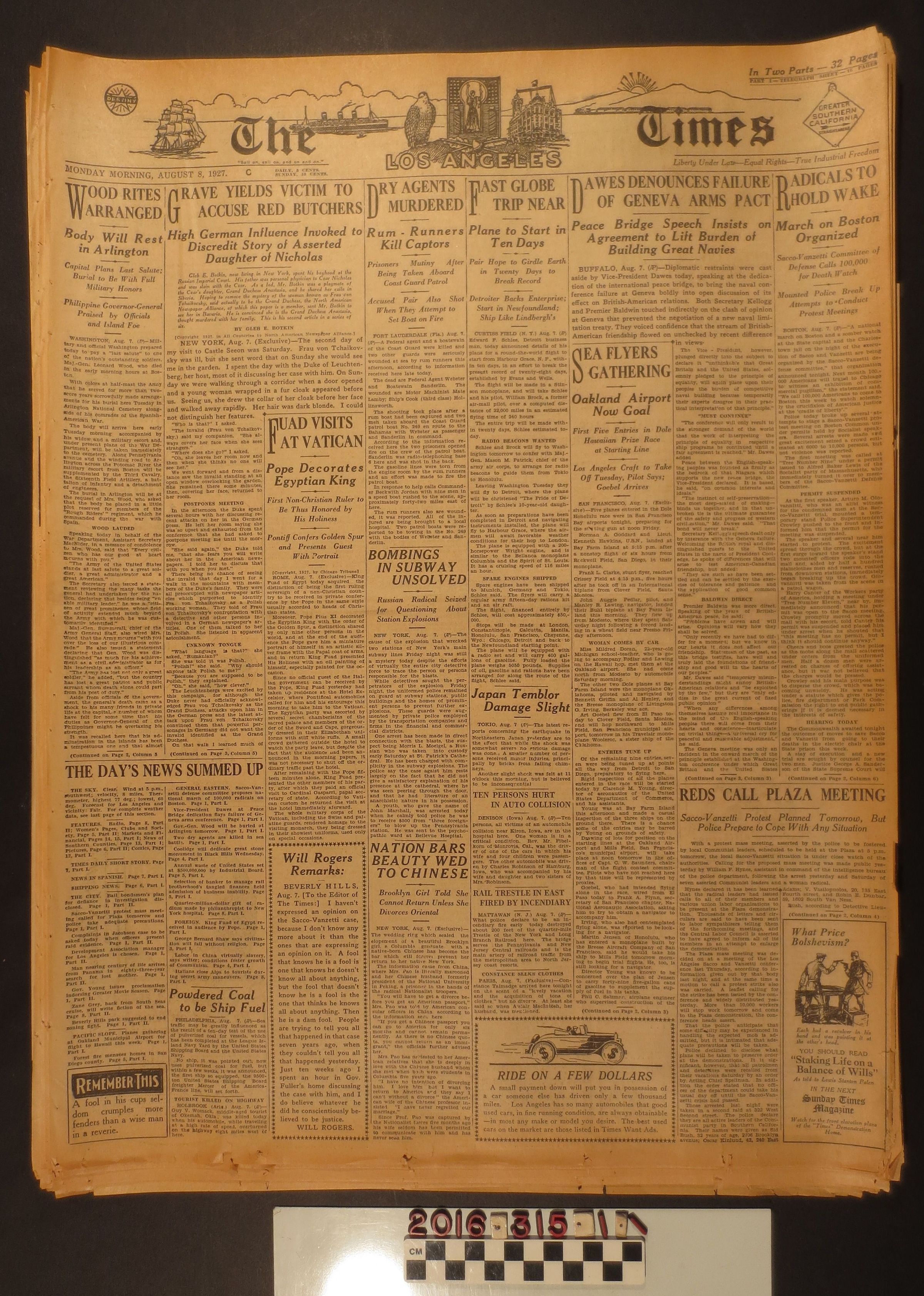 A set of newspapers, the "Los Angeles Times," August 1927. This is not a complete run of the month of August 1927. The sheets are loose, perhaps once part of a bound volume. The overall condition is poor, brittle and yellowed in general. Included are 2, 3, 5, 6, 7, 8, 9, 10, 12, 14, 15, 16, 18, 21, 22, 24, 26, 27, 29, 30, 31 August 1927.